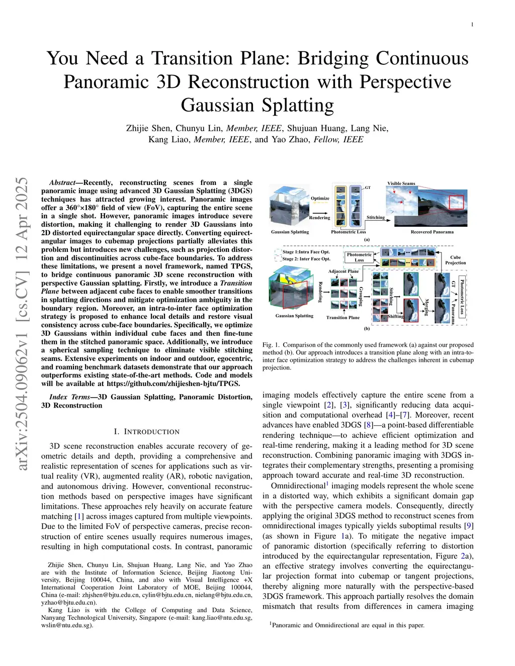 Recently, reconstructing scenes from a single panoramic image using advanced 3D Gaussian Splatting (3DGS) techniques has attracted growing interest. Panoramic images offer a 360 180 field of view (FoV), capturing the entire scene in a single shot. However, panoramic images introduce severe distortion, making it challenging to render 3D Gaussians into 2D distorted equirectangular space directly. Converting equirectangular images to cubemap projections partially alleviates this problem but introduces new challenges, such as projection distortion and discontinuities across cube-face boundaries. To address these limitations, we present a novel framework, named TPGS, to bridge continuous panoramic 3D scene reconstruction with perspective Gaussian splatting. Firstly, we introduce a Transition Plane between adjacent cube faces to enable smoother transitions in splatting directions and mitigate optimization ambiguity in the boundary region. Moreover, an intra-to-inter face optimization strategy is proposed to enhance local details and restore visual consistency across cube-face boundaries. Specifically, we optimize 3D Gaussians within individual cube faces and then fine-tune them in the stitched panoramic space. Additionally, we introduce a spherical sampling technique to eliminate visible stitching seams. Extensive experiments on indoor and outdoor, egocentric, and roaming benchmark datasets demonstrate that our approach outperforms existing state-of-the-art methods. Code and models will be available atthis https URL.