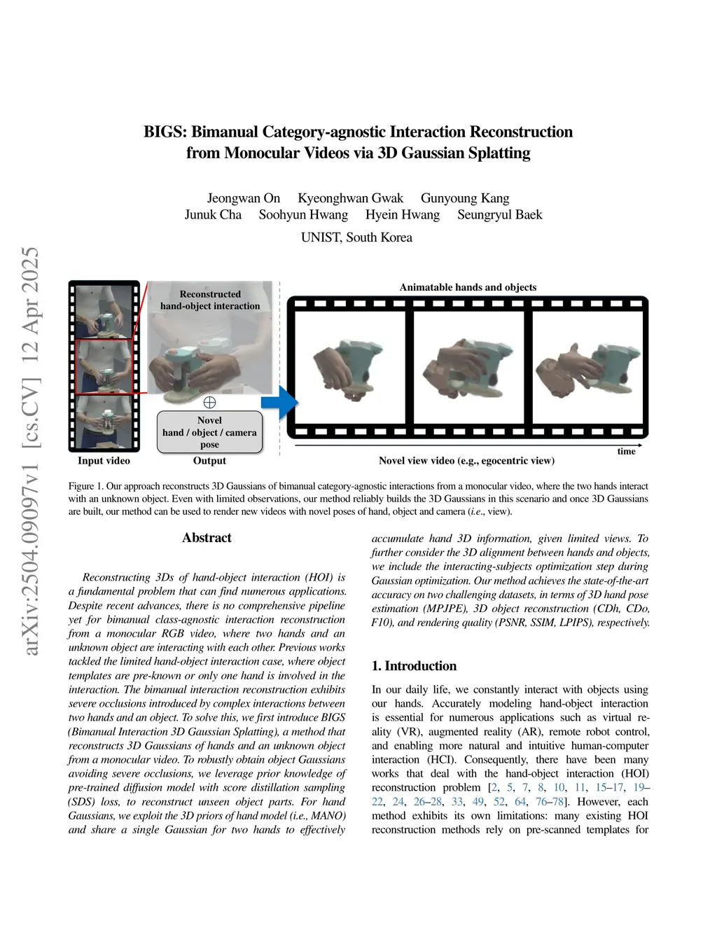 Reconstructing 3Ds of hand-object interaction (HOI) is a fundamental problem that can find numerous applications. Despite recent advances, there is no comprehensive pipeline yet for bimanual class-agnostic interaction reconstruction from a monocular RGB video, where two hands and an unknown object are interacting with each other. Previous works tackled the limited hand-object interaction case, where object templates are pre-known or only one hand is involved in the interaction. The bimanual interaction reconstruction exhibits severe occlusions introduced by complex interactions between two hands and an object. To solve this, we first introduce BIGS (Bimanual Interaction 3D Gaussian Splatting), a method that reconstructs 3D Gaussians of hands and an unknown object from a monocular video. To robustly obtain object Gaussians avoiding severe occlusions, we leverage prior knowledge of pre-trained diffusion model with score distillation sampling (SDS) loss, to reconstruct unseen object parts. For hand Gaussians, we exploit the 3D priors of hand model (i.e., MANO) and share a single Gaussian for two hands to effectively accumulate hand 3D information, given limited views. To further consider the 3D alignment between hands and objects, we include the interacting-subjects optimization step during Gaussian optimization. Our method achieves the state-of-the-art accuracy on two challenging datasets, in terms of 3D hand pose estimation (MPJPE), 3D object reconstruction (CDh, CDo, F10), and rendering quality (PSNR, SSIM, LPIPS), respectively.