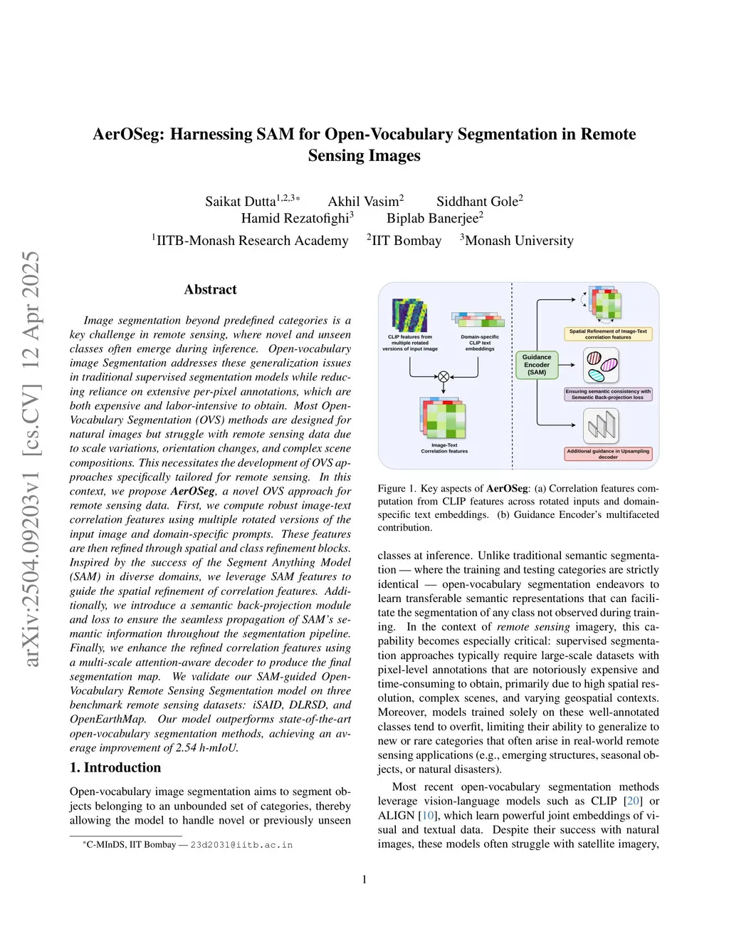 Image segmentation beyond predefined categories is a key challenge in remote sensing, where novel and unseen classes often emerge during inference. Open-vocabulary image Segmentation addresses these generalization issues in traditional supervised segmentation models while reducing reliance on extensive per-pixel annotations, which are both expensive and labor-intensive to obtain. Most Open-Vocabulary Segmentation (OVS) methods are designed for natural images but struggle with remote sensing data due to scale variations, orientation changes, and complex scene compositions. This necessitates the development of OVS approaches specifically tailored for remote sensing. In this context, we propose AerOSeg, a novel OVS approach for remote sensing data. First, we compute robust image-text correlation features using multiple rotated versions of the input image and domain-specific prompts. These features are then refined through spatial and class refinement blocks. Inspired by the success of the Segment Anything Model (SAM) in diverse domains, we leverage SAM features to guide the spatial refinement of correlation features. Additionally, we introduce a semantic back-projection module and loss to ensure the seamless propagation of SAM's semantic information throughout the segmentation pipeline. Finally, we enhance the refined correlation features using a multi-scale attention-aware decoder to produce the final segmentation map. We validate our SAM-guided Open-Vocabulary Remote Sensing Segmentation model on three benchmark remote sensing datasets: iSAID, DLRSD, and OpenEarthMap. Our model outperforms state-of-the-art open-vocabulary segmentation methods, achieving an average improvement of 2.54 h-mIoU.