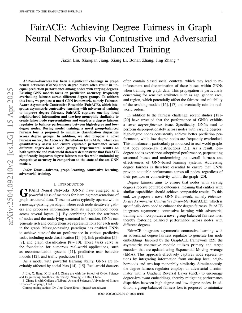 Fairness has been a significant challenge in graph neural networks (GNNs) since degree biases often result in un-equal prediction performance among nodes with varying degrees. Existing GNN models focus on prediction accuracy, frequently overlooking fairness across different degree groups. To addressthis issue, we propose a novel GNN framework, namely Fairness- Aware Asymmetric Contrastive Ensemble (FairACE), which inte-grates asymmetric contrastive learning with adversarial training to improve degree fairness. FairACE captures one-hop local neighborhood information and two-hop monophily similarity to create fairer node representations and employs a degree fairness regulator to balance performance between high-degree and low-degree nodes. During model training, a novel group-balanced fairness loss is proposed to minimize classification disparities across degree groups. In addition, we also propose a novel fairness metric, the Accuracy Distribution Gap (ADG), which can quantitatively assess and ensure equitable performance across different degree-based node groups. Experimental results on both synthetic and real-world datasets demonstrate that FairACE significantly improves degree fairness metrics while maintaining competitive accuracy in comparison to the state-of-the-art GNN models.