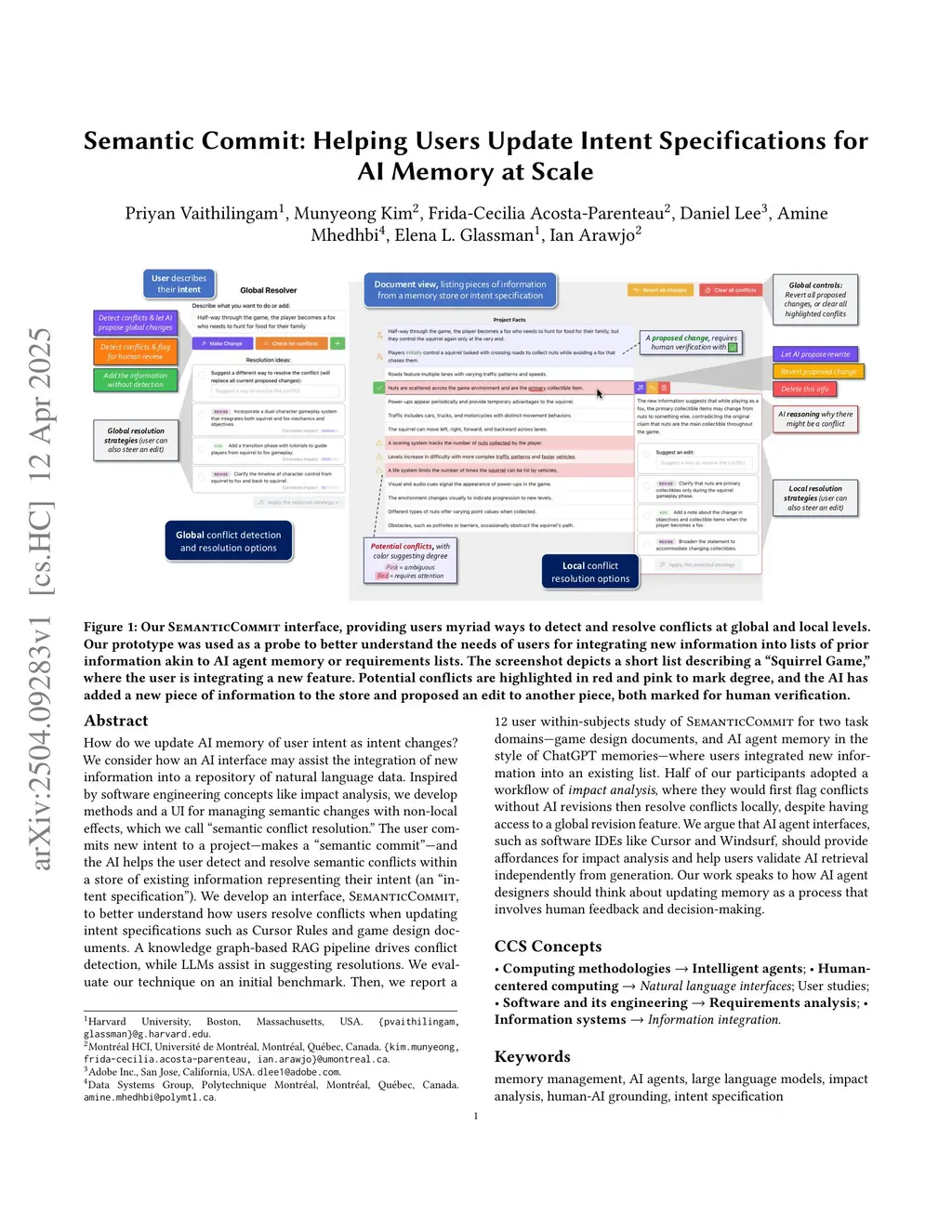 How do we update AI memory of user intent as intent changes? We consider how an AI interface may assist the integration of new information into a repository of natural language data. Inspired by software engineering concepts like impact analysis, we develop methods and a UI for managing semantic changes with non-local effects, which we call "semantic conflict resolution." The user commits new intent to a project -- makes a "semantic commit" -- and the AI helps the user detect and resolve semantic conflicts within a store of existing information representing their intent (an "intent specification"). We develop an interface, SemanticCommit, to better understand how users resolve conflicts when updating intent specifications such as Cursor Rules and game design documents. A knowledge graph-based RAG pipeline drives conflict detection, while LLMs assist in suggesting resolutions. We evaluate our technique on an initial benchmark. Then, we report a 12 user within-subjects study of SemanticCommit for two task domains -- game design documents, and AI agent memory in the style of ChatGPT memories -- where users integrated new information into an existing list. Half of our participants adopted a workflow of impact analysis, where they would first flag conflicts without AI revisions then resolve conflicts locally, despite having access to a global revision feature. We argue that AI agent interfaces, such as software IDEs like Cursor and Windsurf, should provide affordances for impact analysis and help users validate AI retrieval independently from generation. Our work speaks to how AI agent designers should think about updating memory as a process that involves human feedback and decision-making.
