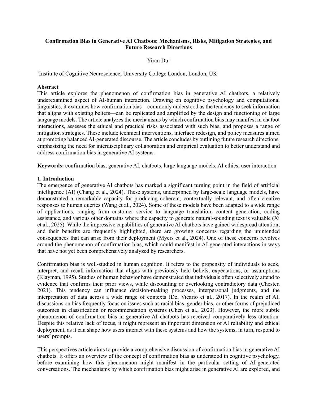 This article explores the phenomenon of confirmation bias in generative AI chatbots, a relatively underexamined aspect of AI-human interaction. Drawing on cognitive psychology and computational linguistics, it examines how confirmation bias, commonly understood as the tendency to seek information that aligns with existing beliefs, can be replicated and amplified by the design and functioning of large language models. The article analyzes the mechanisms by which confirmation bias may manifest in chatbot interactions, assesses the ethical and practical risks associated with such bias, and proposes a range of mitigation strategies. These include technical interventions, interface redesign, and policy measures aimed at promoting balanced AI-generated discourse. The article concludes by outlining future research directions, emphasizing the need for interdisciplinary collaboration and empirical evaluation to better understand and address confirmation bias in generative AI systems.