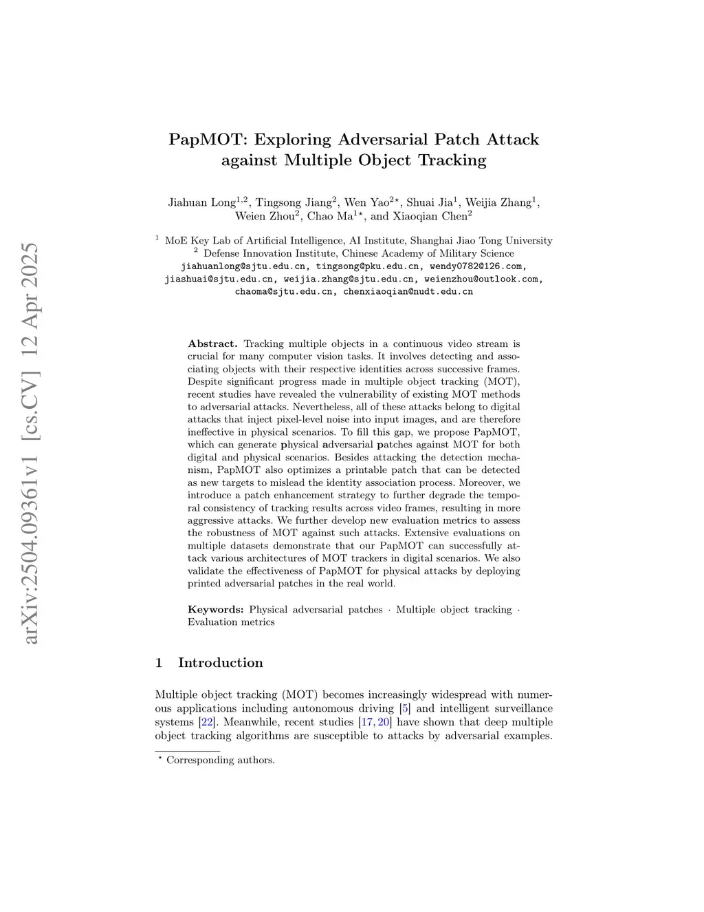 Tracking multiple objects in a continuous video stream is crucial for many computer vision tasks. It involves detecting and associating objects with their respective identities across successive frames. Despite significant progress made in multiple object tracking (MOT), recent studies have revealed the vulnerability of existing MOT methods to adversarial attacks. Nevertheless, all of these attacks belong to digital attacks that inject pixel-level noise into input images, and are therefore ineffective in physical scenarios. To fill this gap, we propose PapMOT, which can generate physical adversarial patches against MOT for both digital and physical scenarios. Besides attacking the detection mechanism, PapMOT also optimizes a printable patch that can be detected as new targets to mislead the identity association process. Moreover, we introduce a patch enhancement strategy to further degrade the temporal consistency of tracking results across video frames, resulting in more aggressive attacks. We further develop new evaluation metrics to assess the robustness of MOT against such attacks. Extensive evaluations on multiple datasets demonstrate that our PapMOT can successfully attack various architectures of MOT trackers in digital scenarios. We also validate the effectiveness of PapMOT for physical attacks by deploying printed adversarial patches in the real world.