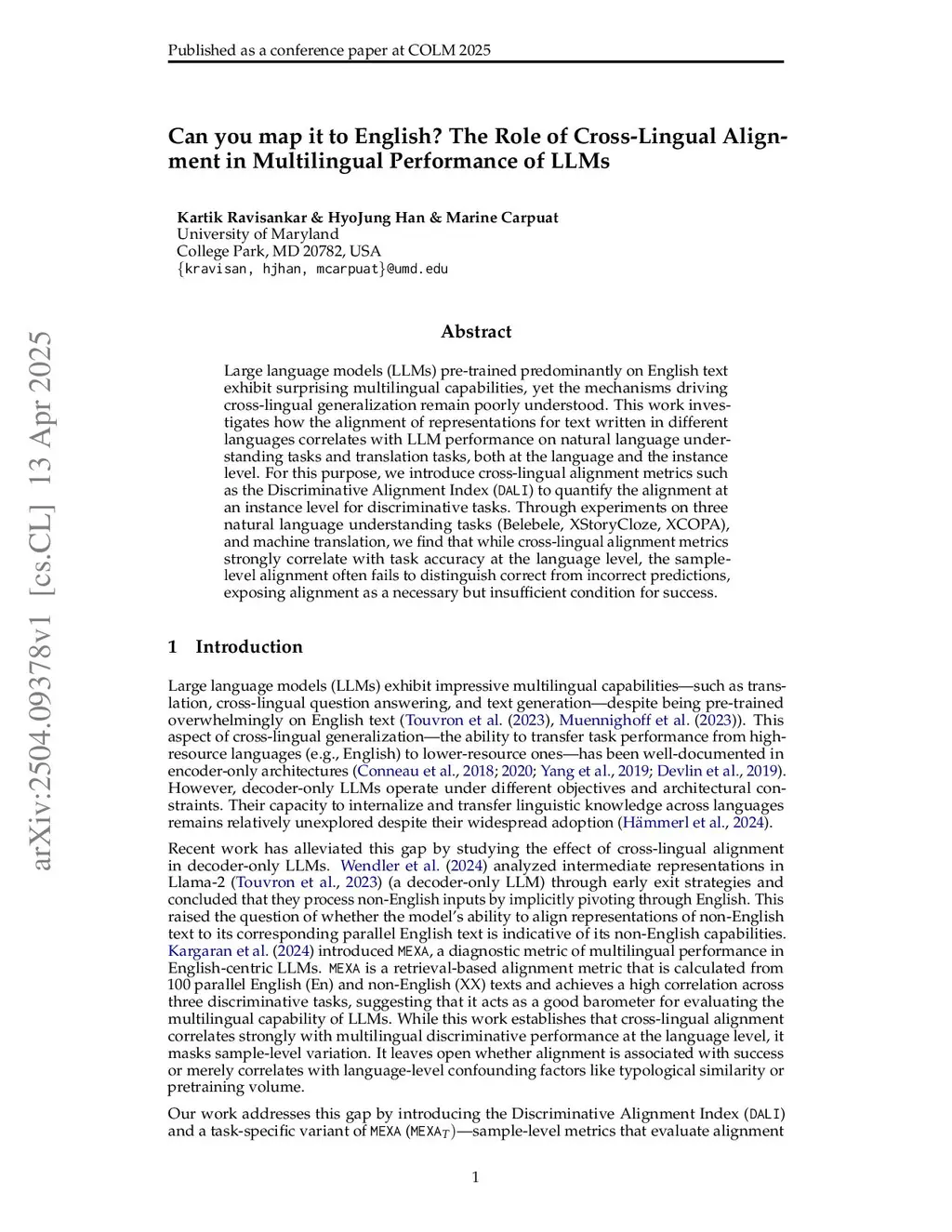 Can you map it to English? The Role of Cross-Lingual Alignment in Multilingual Performance of LLMs
