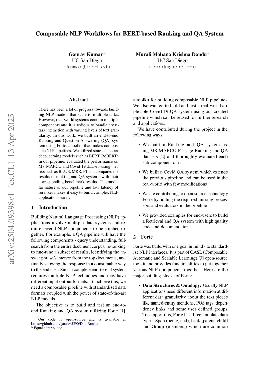 There has been a lot of progress towards building NLP models that scale to multiple tasks. However, real-world systems contain multiple components and it is tedious to handle cross-task interaction with varying levels of text granularity. In this work, we built an end-to-end Ranking and Question-Answering (QA) system using Forte, a toolkit that makes composable NLP pipelines. We utilized state-of-the-art deep learning models such as BERT, RoBERTa in our pipeline, evaluated the performance on MS-MARCO and Covid-19 datasets using metrics such as BLUE, MRR, F1 and compared the results of ranking and QA systems with their corresponding benchmark results. The modular nature of our pipeline and low latency of reranker makes it easy to build complex NLP applications easily.