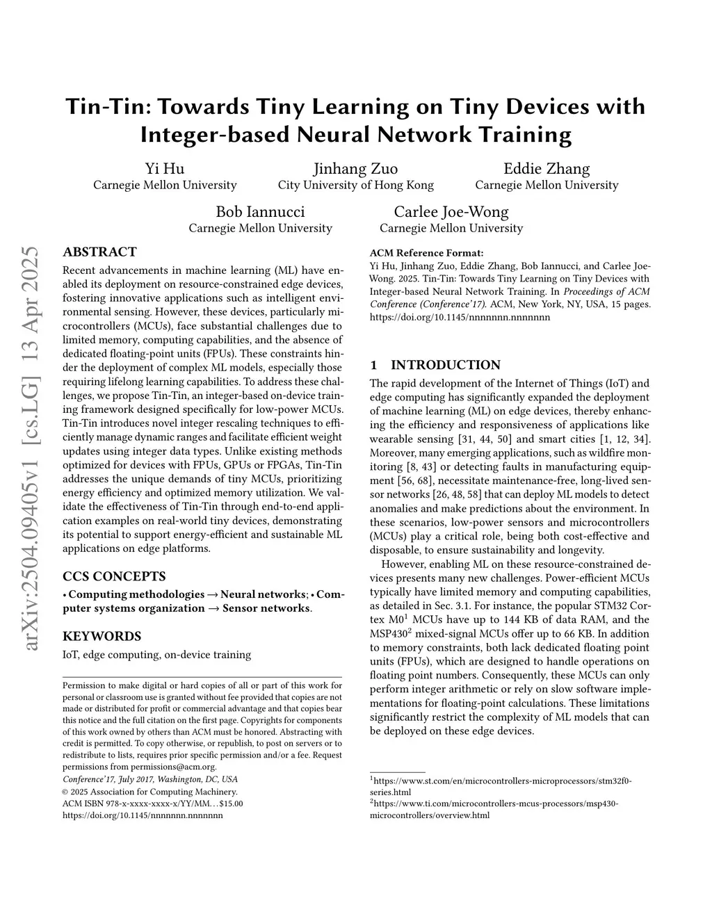 Recent advancements in machine learning (ML) have enabled its deployment on resource-constrained edge devices, fostering innovative applications such as intelligent environmental sensing. However, these devices, particularly microcontrollers (MCUs), face substantial challenges due to limited memory, computing capabilities, and the absence of dedicated floating-point units (FPUs). These constraints hinder the deployment of complex ML models, especially those requiring lifelong learning capabilities. To address these challenges, we propose Tin-Tin, an integer-based on-device training framework designed specifically for low-power MCUs. Tin-Tin introduces novel integer rescaling techniques to efficiently manage dynamic ranges and facilitate efficient weight updates using integer data types. Unlike existing methods optimized for devices with FPUs, GPUs, or FPGAs, Tin-Tin addresses the unique demands of tiny MCUs, prioritizing energy efficiency and optimized memory utilization. We validate the effectiveness of Tin-Tin through end-to-end application examples on real-world tiny devices, demonstrating its potential to support energy-efficient and sustainable ML applications on edge platforms.