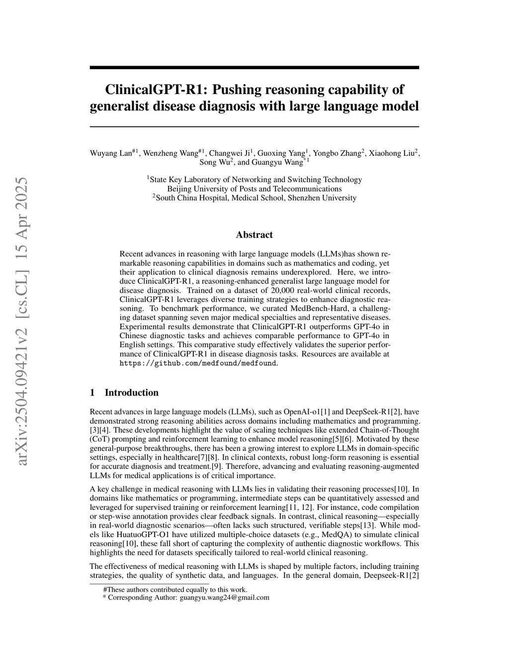 Recent advances in reasoning with large language models (LLMs)has shown remarkable reasoning capabilities in domains such as mathematics and coding, yet their application to clinical diagnosis remains underexplored. Here, we introduce ClinicalGPT-R1, a reasoning enhanced generalist large language model for disease diagnosis. Trained on a dataset of 20,000 real-world clinical records, ClinicalGPT-R1 leverages diverse training strategies to enhance diagnostic reasoning. To benchmark performance, we curated MedBench-Hard, a challenging dataset spanning seven major medical specialties and representative diseases. Experimental results demonstrate that ClinicalGPT-R1 outperforms GPT-4o in Chinese diagnostic tasks and achieves comparable performance to GPT-4 in English settings. This comparative study effectively validates the superior performance of ClinicalGPT-R1 in disease diagnosis tasks. Resources are available atthis https URL.
