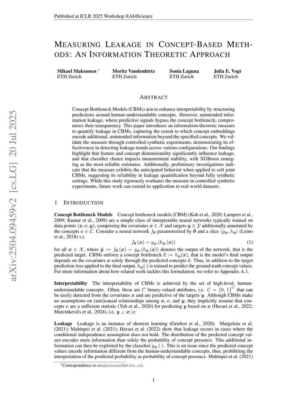 Concept Bottleneck Models (CBMs) aim to enhance interpretability by structuring predictions around human-understandable concepts. However, unintended information leakage, where predictive signals bypass the concept bottleneck, compromises their transparency. This paper introduces an information-theoretic measure to quantify leakage in CBMs, capturing the extent to which concept embeddings encode additional, unintended information beyond the specified concepts. We validate the measure through controlled synthetic experiments, demonstrating its effectiveness in detecting leakage trends across various configurations. Our findings highlight that feature and concept dimensionality significantly influence leakage, and that classifier choice impacts measurement stability, with XGBoost emerging as the most reliable estimator. Additionally, preliminary investigations indicate that the measure exhibits the anticipated behavior when applied to soft joint CBMs, suggesting its reliability in leakage quantification beyond fully synthetic settings. While this study rigorously evaluates the measure in controlled synthetic experiments, future work can extend its application to real-world datasets.