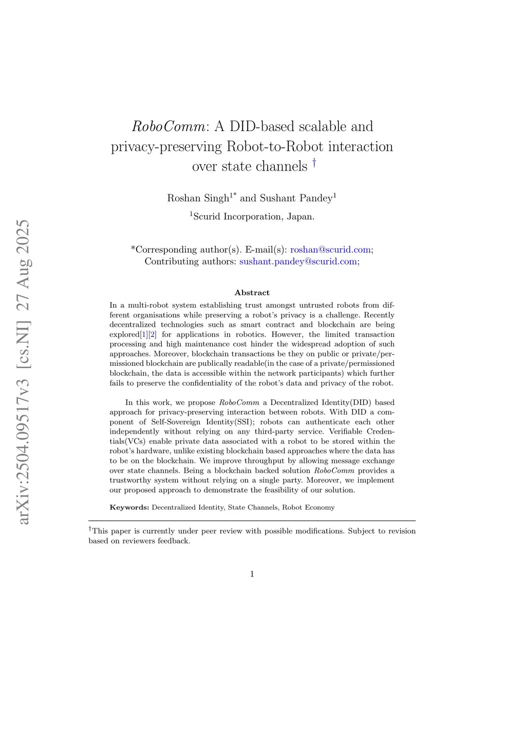 RoboComm: A DID-based scalable and privacy-preserving Robot-to-Robot interaction over state channels