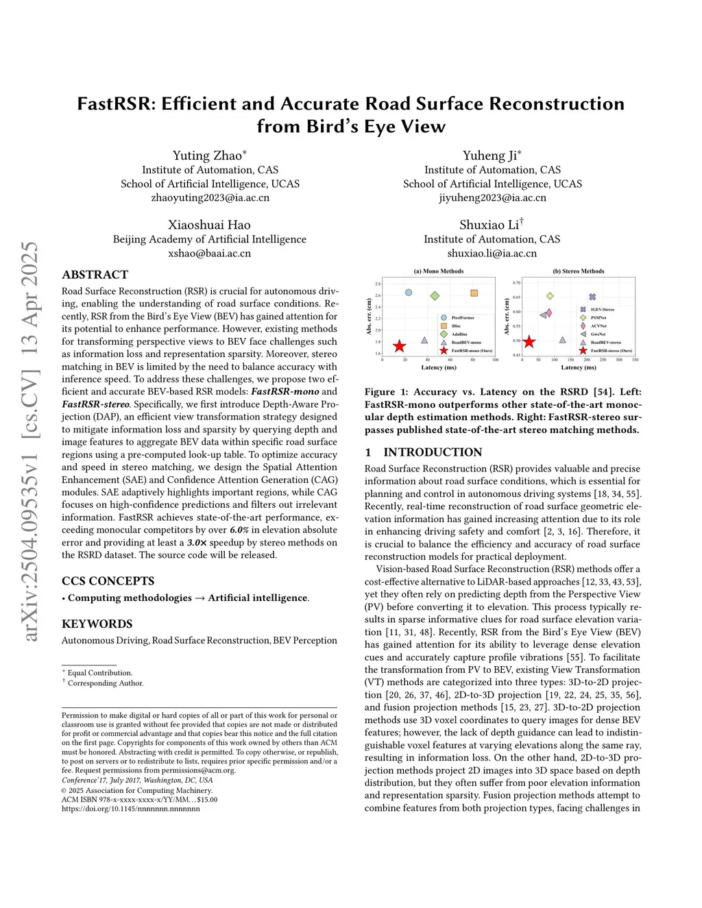 Road Surface Reconstruction (RSR) is crucial for autonomous driving, enabling the understanding of road surface conditions. Recently, RSR from the Bird's Eye View (BEV) has gained attention for its potential to enhance performance. However, existing methods for transforming perspective views to BEV face challenges such as information loss and representation sparsity. Moreover, stereo matching in BEV is limited by the need to balance accuracy with inference speed. To address these challenges, we propose two efficient and accurate BEV-based RSR models: FastRSR-mono and FastRSR-stereo. Specifically, we first introduce Depth-Aware Projection (DAP), an efficient view transformation strategy designed to mitigate information loss and sparsity by querying depth and image features to aggregate BEV data within specific road surface regions using a pre-computed look-up table. To optimize accuracy and speed in stereo matching, we design the Spatial Attention Enhancement (SAE) and Confidence Attention Generation (CAG) modules. SAE adaptively highlights important regions, while CAG focuses on high-confidence predictions and filters out irrelevant information. FastRSR achieves state-of-the-art performance, exceeding monocular competitors by over 6.0% in elevation absolute error and providing at least a 3.0x speedup by stereo methods on the RSRD dataset. The source code will be released.