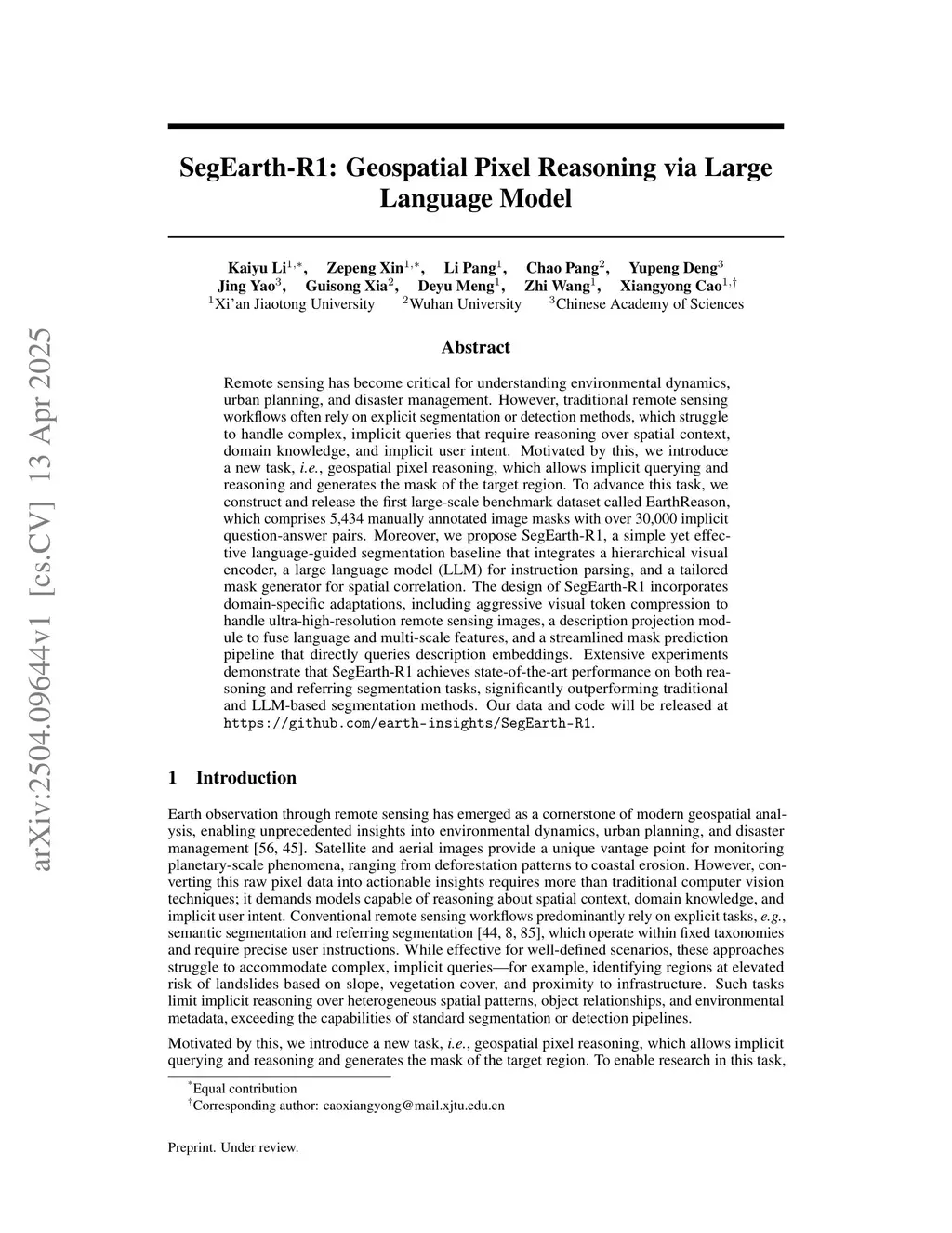 Remote sensing has become critical for understanding environmental dynamics, urban planning, and disaster management. However, traditional remote sensing workflows often rely on explicit segmentation or detection methods, which struggle to handle complex, implicit queries that require reasoning over spatial context, domain knowledge, and implicit user intent. Motivated by this, we introduce a new task, \ie, geospatial pixel reasoning, which allows implicit querying and reasoning and generates the mask of the target region. To advance this task, we construct and release the first large-scale benchmark dataset called EarthReason, which comprises 5,434 manually annotated image masks with over 30,000 implicit question-answer pairs. Moreover, we propose SegEarth-R1, a simple yet effective language-guided segmentation baseline that integrates a hierarchical visual encoder, a large language model (LLM) for instruction parsing, and a tailored mask generator for spatial correlation. The design of SegEarth-R1 incorporates domain-specific adaptations, including aggressive visual token compression to handle ultra-high-resolution remote sensing images, a description projection module to fuse language and multi-scale features, and a streamlined mask prediction pipeline that directly queries description embeddings. Extensive experiments demonstrate that SegEarth-R1 achieves state-of-the-art performance on both reasoning and referring segmentation tasks, significantly outperforming traditional and LLM-based segmentation methods. Our data and code will be released atthis https URL.