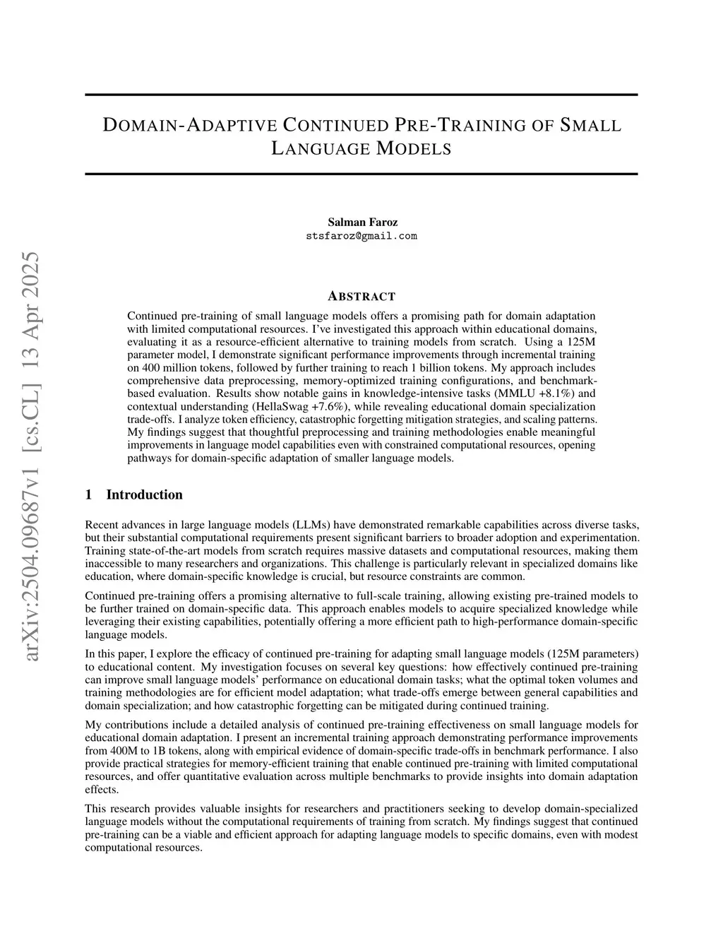 Continued pre-training of small language models offers a promising path for domain adaptation with limited computational resources. I've investigated this approach within educational domains, evaluating it as a resource-efficient alternative to training models from scratch. Using a 125M parameter model, I demonstrate significant performance improvements through incremental training on 400 million tokens, followed by further training to reach 1 billion tokens. My approach includes comprehensive data preprocessing, memory-optimized training configurations, and benchmark-based evaluation. Results show notable gains in knowledge-intensive tasks (MMLU +8.1%) and contextual understanding (HellaSwag +7.6%), while revealing educational domain specialization trade-offs. I analyze token efficiency, catastrophic forgetting mitigation strategies, and scaling patterns. My findings suggest that thoughtful preprocessing and training methodologies enable meaningful improvements in language model capabilities even with constrained computational resources, opening pathways for domain-specific adaptation of smaller language models.