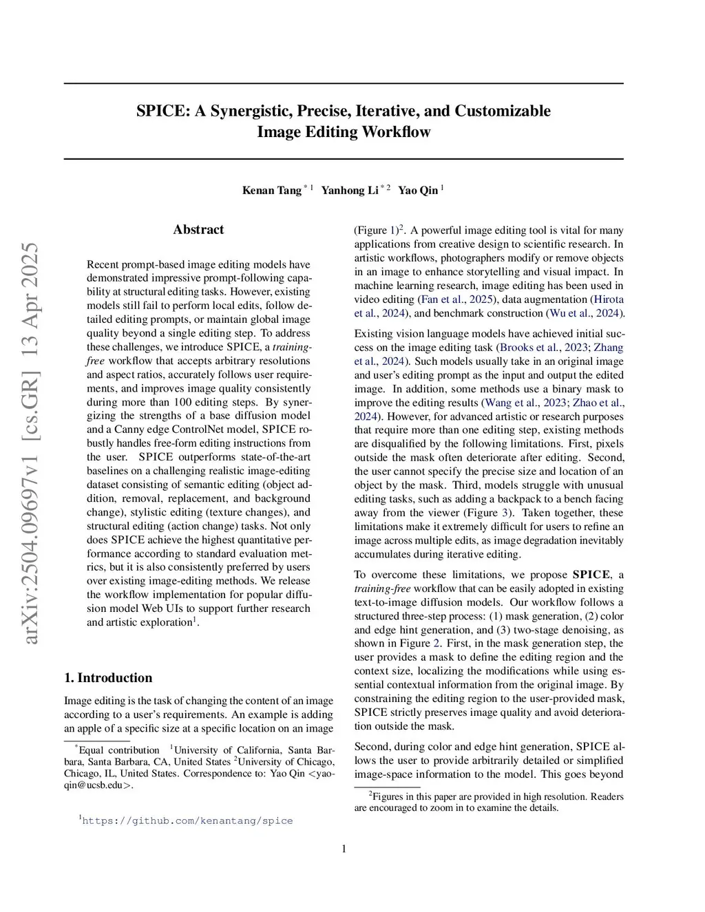 Prompt-based models have demonstrated impressive prompt-following capability at image editing tasks. However, the models still struggle with following detailed editing prompts or performing local edits. Specifically, global image quality often deteriorates immediately after a single editing step. To address these challenges, we introduce SPICE, a training-free workflow that accepts arbitrary resolutions and aspect ratios, accurately follows user requirements, and consistently improves image quality during more than 100 editing steps, while keeping the unedited regions intact. By synergizing the strengths of a base diffusion model and a Canny edge ControlNet model, SPICE robustly handles free-form editing instructions from the user. On a challenging realistic image-editing dataset, SPICE quantitatively outperforms state-of-the-art baselines and is consistently preferred by human annotators. We release the workflow implementation for popular diffusion model Web UIs to support further research and artistic exploration.