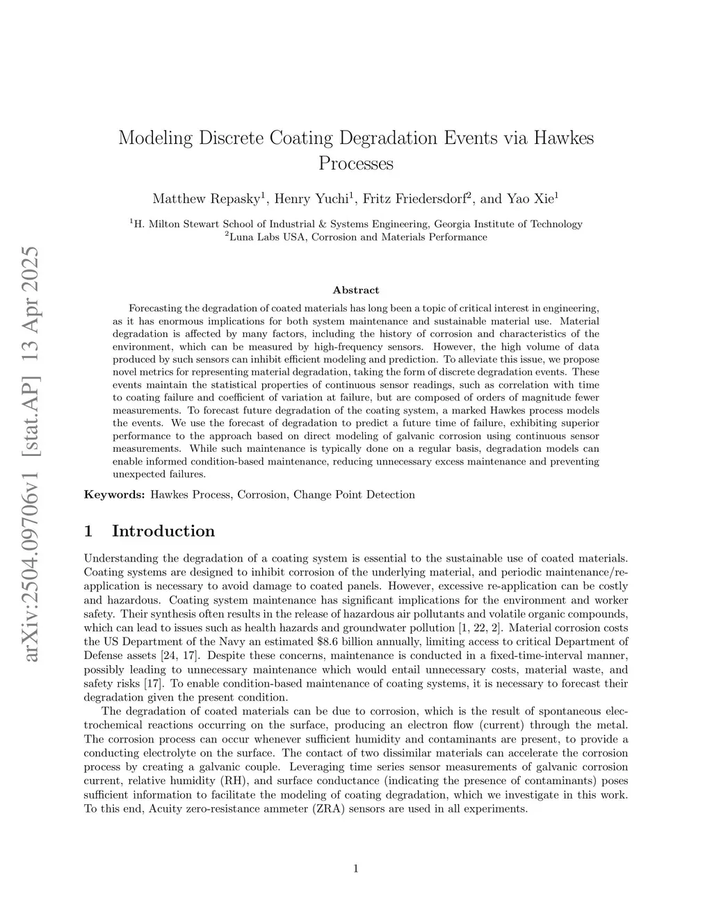 Forecasting the degradation of coated materials has long been a topic of critical interest in engineering, as it has enormous implications for both system maintenance and sustainable material use. Material degradation is affected by many factors, including the history of corrosion and characteristics of the environment, which can be measured by high-frequency sensors. However, the high volume of data produced by such sensors can inhibit efficient modeling and prediction. To alleviate this issue, we propose novel metrics for representing material degradation, taking the form of discrete degradation events. These events maintain the statistical properties of continuous sensor readings, such as correlation with time to coating failure and coefficient of variation at failure, but are composed of orders of magnitude fewer measurements. To forecast future degradation of the coating system, a marked Hawkes process models the events. We use the forecast of degradation to predict a future time of failure, exhibiting superior performance to the approach based on direct modeling of galvanic corrosion using continuous sensor measurements. While such maintenance is typically done on a regular basis, degradation models can enable informed condition-based maintenance, reducing unnecessary excess maintenance and preventing unexpected failures.