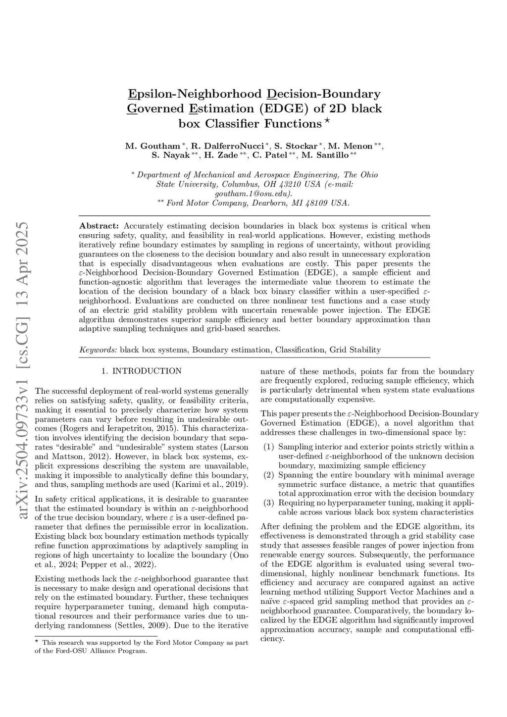 Accurately estimating decision boundaries in black box systems is critical when ensuring safety, quality, and feasibility in real-world applications. However, existing methods iteratively refine boundary estimates by sampling in regions of uncertainty, without providing guarantees on the closeness to the decision boundary and also result in unnecessary exploration that is especially disadvantageous when evaluations are costly. This paper presents -Neighborhood Decision-Boundary Governed Estimation (EDGE), a sample efficient and function-agnostic algorithm that leverages the intermediate value theorem to estimate the location of the decision boundary of a black box binary classifier within a user-specified -neighborhood. To demonstrate applicability, a case study is presented of an electric grid stability problem with uncertain renewable power injection. Evaluations are conducted on three test functions, where it is seen that the EDGE algorithm demonstrates superior sample efficiency and better boundary approximation than adaptive sampling techniques and grid-based searches.