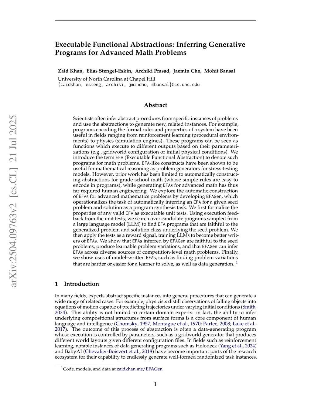 Scientists often infer abstract procedures from specific instances of problems and use the abstractions to generate new, related instances. For example, programs encoding the formal rules and properties of a system have been useful in fields ranging from reinforcement learning (procedural environments) to physics (simulation engines). These programs can be seen as functions which execute to different outputs based on their parameterizations (e.g., gridworld configuration or initial physical conditions). We introduce the term EFA (Executable Functional Abstraction) to denote such programs for math problems. EFA-like constructs have been shown to be useful for mathematical reasoning as problem generators for stress-testing models. However, prior work has been limited to automatically constructing abstractions for grade-school math (whose simple rules are easy to encode in programs), while generating EFAs for advanced math has thus far required human engineering. We explore the automatic construction of EFAs for advanced mathematics problems by developing EFAGen, which operationalizes the task of automatically inferring an EFA for a given seed problem and solution as a program synthesis task. We first formalize the properties of any valid EFA as executable unit tests. Using execution feedback from the unit tests, we search over candidate programs sampled from a LLM to find EFA programs that are faithful to the generalized problem and solution class underlying the seed problem. We then apply the tests as a reward signal, training LLMs to become better writers of EFAs. We show that EFAs inferred by EFAGen are faithful to the seed problems, produce learnable problem variations, and that EFAGen can infer EFAs across diverse sources of competition-level math problems. Finally, we show uses of model-written EFAs e.g., finding harder/easier problem variants, as well as data generation.