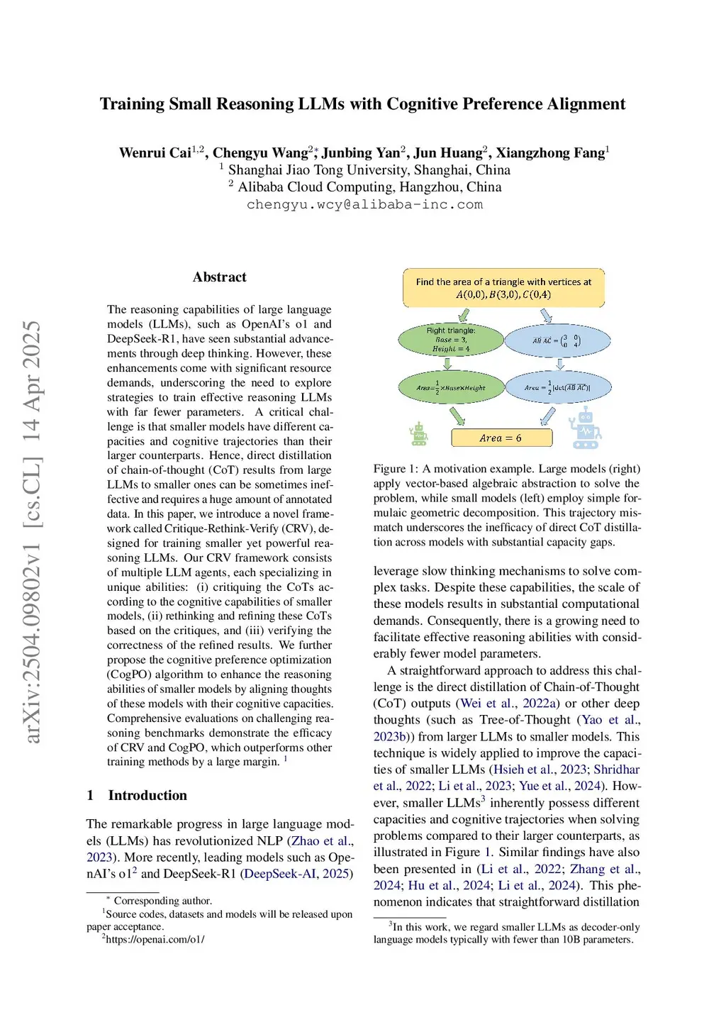 The reasoning capabilities of large reasoning models (LRMs), such as OpenAI's o1 and DeepSeek-R1, have seen substantial advancements through deep thinking. However, these enhancements come with significant resource demands, underscoring the need for training effective small reasoning models. A critical challenge is that small models possess different reasoning capacities and cognitive trajectories compared with their larger counterparts. Hence, directly distilling chain-of-thought (CoT) rationales from large LRMs to smaller ones can sometimes be ineffective and often requires a substantial amount of annotated data. In this paper, we first introduce a novel Critique-Rethink-Verify (CRV) system, designed for training smaller yet powerful LRMs. Our CRV system consists of multiple LLM agents, each specializing in unique tasks: (i) critiquing the CoT rationales according to the cognitive capabilities of smaller models, (ii) rethinking and refining these CoTs based on the critiques, and (iii) verifying the correctness of the refined results. Building on the CRV system, we further propose the Cognitive Preference Optimization (CogPO) algorithm to continuously enhance the reasoning abilities of smaller models by aligning their reasoning processes with their cognitive capacities. Comprehensive evaluations on challenging reasoning benchmarks demonstrate the efficacy of our CRV+CogPO framework, which outperforms other methods by a large margin.
