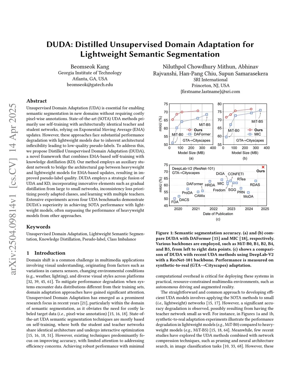 DUDA: Distilled Unsupervised Domain Adaptation for Lightweight Semantic Segmentation