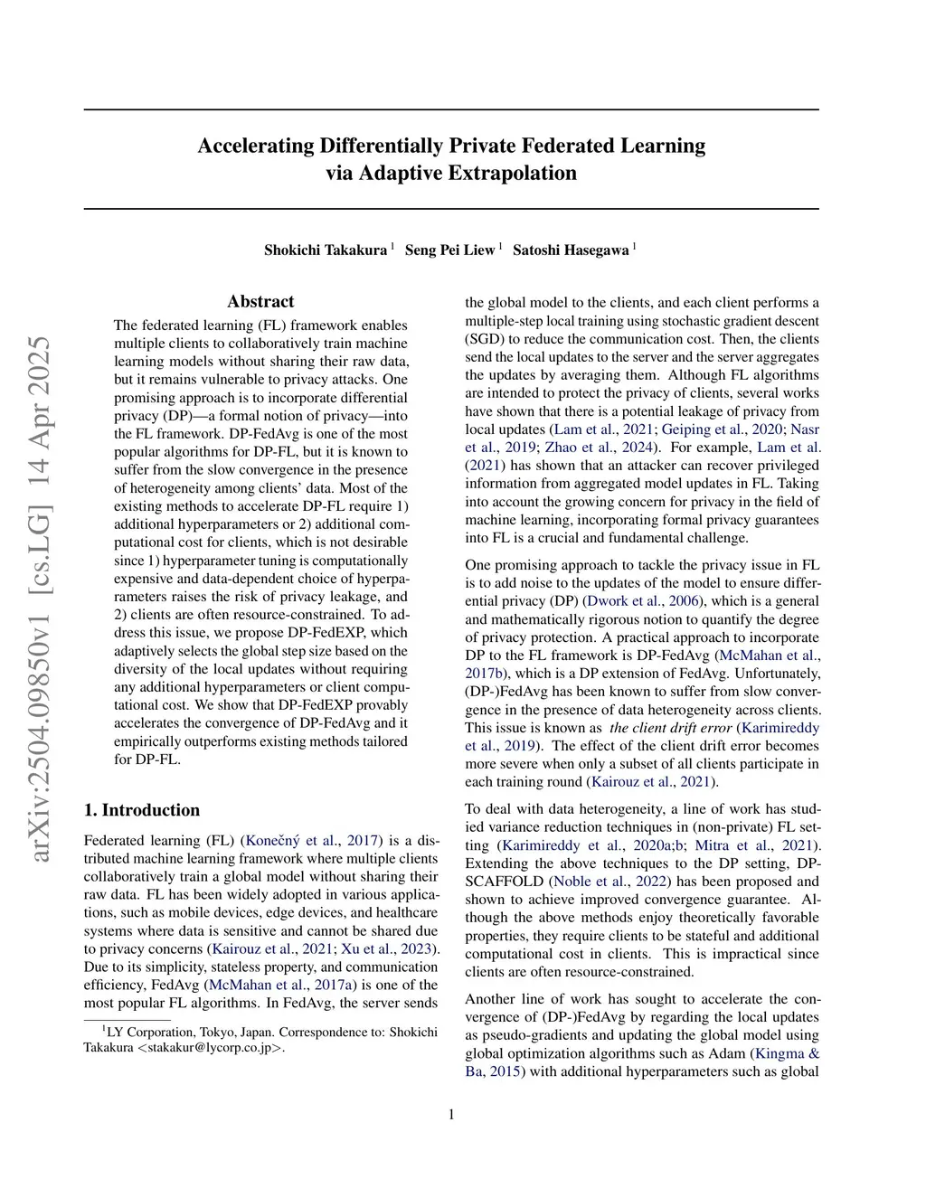 The federated learning (FL) framework enables multiple clients to collaboratively train machine learning models without sharing their raw data, but it remains vulnerable to privacy attacks. One promising approach is to incorporate differential privacy (DP)-a formal notion of privacy-into the FL framework. DP-FedAvg is one of the most popular algorithms for DP-FL, but it is known to suffer from the slow convergence in the presence of heterogeneity among clients' data. Most of the existing methods to accelerate DP-FL require 1) additional hyperparameters or 2) additional computational cost for clients, which is not desirable since 1) hyperparameter tuning is computationally expensive and data-dependent choice of hyperparameters raises the risk of privacy leakage, and 2) clients are often resource-constrained. To address this issue, we propose DP-FedEXP, which adaptively selects the global step size based on the diversity of the local updates without requiring any additional hyperparameters or client computational cost. We show that DP-FedEXP provably accelerates the convergence of DP-FedAvg and it empirically outperforms existing methods tailored for DP-FL.