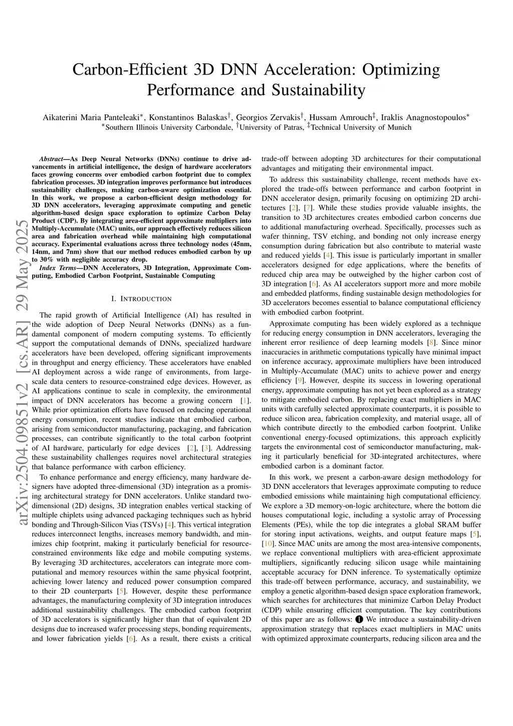 As Deep Neural Networks (DNNs) continue to drive advancements in artificial intelligence, the design of hardware accelerators faces growing concerns over embodied carbon footprint due to complex fabrication processes. 3D integration improves performance but introduces sustainability challenges, making carbon-aware optimization essential. In this work, we propose a carbon-efficient design methodology for 3D DNN accelerators, leveraging approximate computing and genetic algorithm-based design space exploration to optimize Carbon Delay Product (CDP). By integrating area-efficient approximate multipliers into Multiply-Accumulate (MAC) units, our approach effectively reduces silicon area and fabrication overhead while maintaining high computational accuracy. Experimental evaluations across three technology nodes (45nm, 14nm, and 7nm) show that our method reduces embodied carbon by up to 30% with negligible accuracy drop.