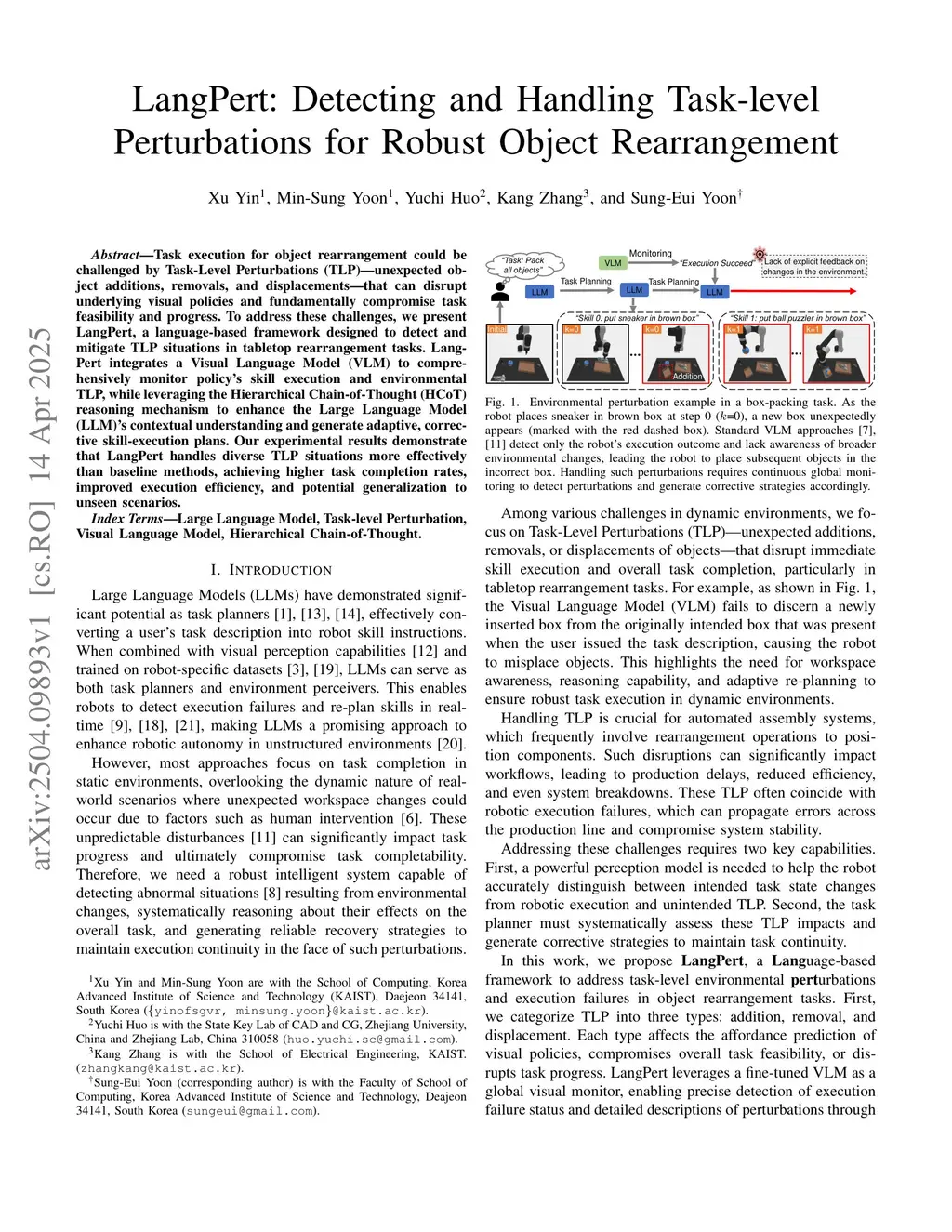 Task execution for object rearrangement could be challenged by Task-Level Perturbations (TLP), i.e., unexpected object additions, removals, and displacements that can disrupt underlying visual policies and fundamentally compromise task feasibility and progress. To address these challenges, we present LangPert, a language-based framework designed to detect and mitigate TLP situations in tabletop rearrangement tasks. LangPert integrates a Visual Language Model (VLM) to comprehensively monitor policy's skill execution and environmental TLP, while leveraging the Hierarchical Chain-of-Thought (HCoT) reasoning mechanism to enhance the Large Language Model (LLM)'s contextual understanding and generate adaptive, corrective skill-execution plans. Our experimental results demonstrate that LangPert handles diverse TLP situations more effectively than baseline methods, achieving higher task completion rates, improved execution efficiency, and potential generalization to unseen scenarios.