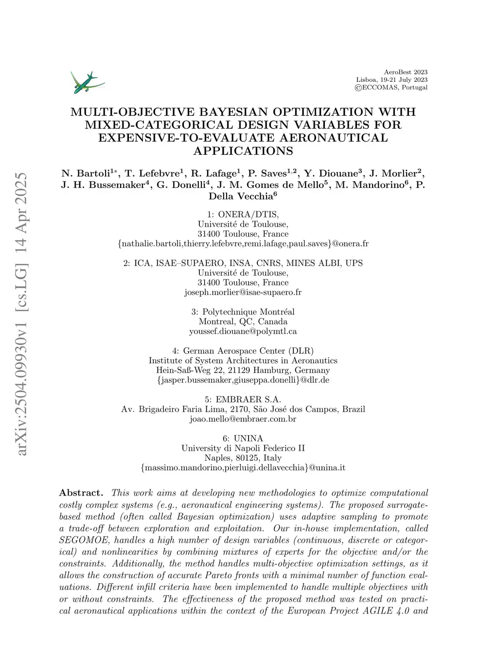 This work aims at developing new methodologies to optimize computational costly complex systems (e.g., aeronautical engineering systems). The proposed surrogate-based method (often called Bayesian optimization) uses adaptive sampling to promote a trade-off between exploration and exploitation. Our in-house implementation, called SEGOMOE, handles a high number of design variables (continuous, discrete or categorical) and nonlinearities by combining mixtures of experts for the objective and/or the constraints. Additionally, the method handles multi-objective optimization settings, as it allows the construction of accurate Pareto fronts with a minimal number of function evaluations. Different infill criteria have been implemented to handle multiple objectives with or without constraints. The effectiveness of the proposed method was tested on practical aeronautical applications within the context of the European Project AGILE 4.0 and demonstrated favorable results. A first example concerns a retrofitting problem where a comparison between two optimizers have been made. A second example introduces hierarchical variables to deal with architecture system in order to design an aircraft family. The third example increases drastically the number of categorical variables as it combines aircraft design, supply chain and manufacturing process. In this article, we show, on three different realistic problems, various aspects of our optimization codes thanks to the diversity of the treated aircraft problems.