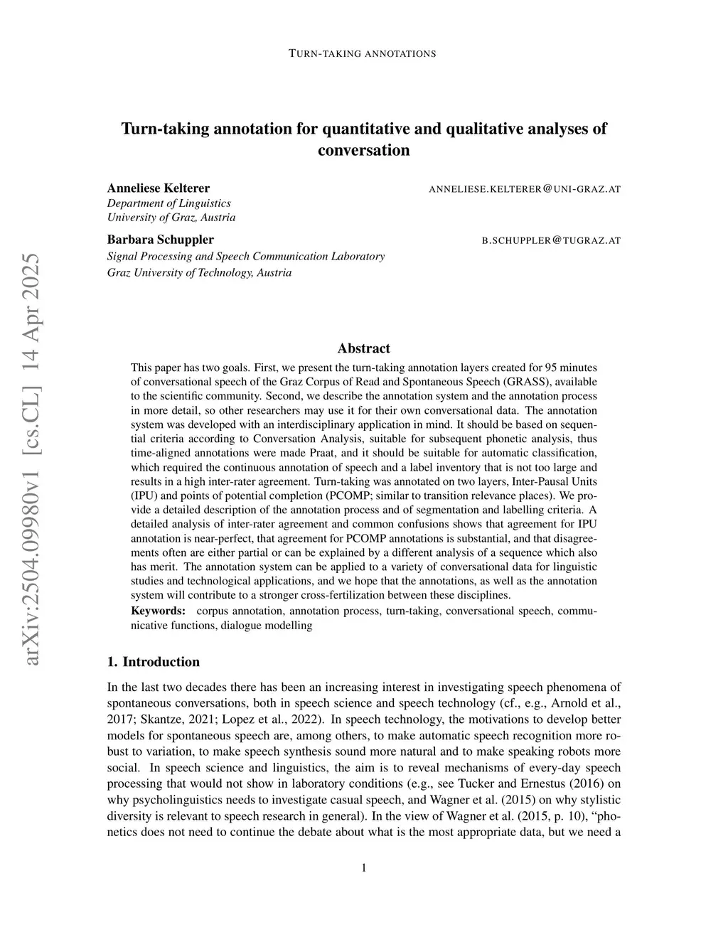 This paper has two goals. First, we present the turn-taking annotation layers created for 95 minutes of conversational speech of the Graz Corpus of Read and Spontaneous Speech (GRASS), available to the scientific community. Second, we describe the annotation system and the annotation process in more detail, so other researchers may use it for their own conversational data. The annotation system was developed with an interdisciplinary application in mind. It should be based on sequential criteria according to Conversation Analysis, suitable for subsequent phonetic analysis, thus time-aligned annotations were made Praat, and it should be suitable for automatic classification, which required the continuous annotation of speech and a label inventory that is not too large and results in a high inter-rater agreement. Turn-taking was annotated on two layers, Inter-Pausal Units (IPU) and points of potential completion (PCOMP; similar to transition relevance places). We provide a detailed description of the annotation process and of segmentation and labelling criteria. A detailed analysis of inter-rater agreement and common confusions shows that agreement for IPU annotation is near-perfect, that agreement for PCOMP annotations is substantial, and that disagreements often are either partial or can be explained by a different analysis of a sequence which also has merit. The annotation system can be applied to a variety of conversational data for linguistic studies and technological applications, and we hope that the annotations, as well as the annotation system will contribute to a stronger cross-fertilization between these disciplines.