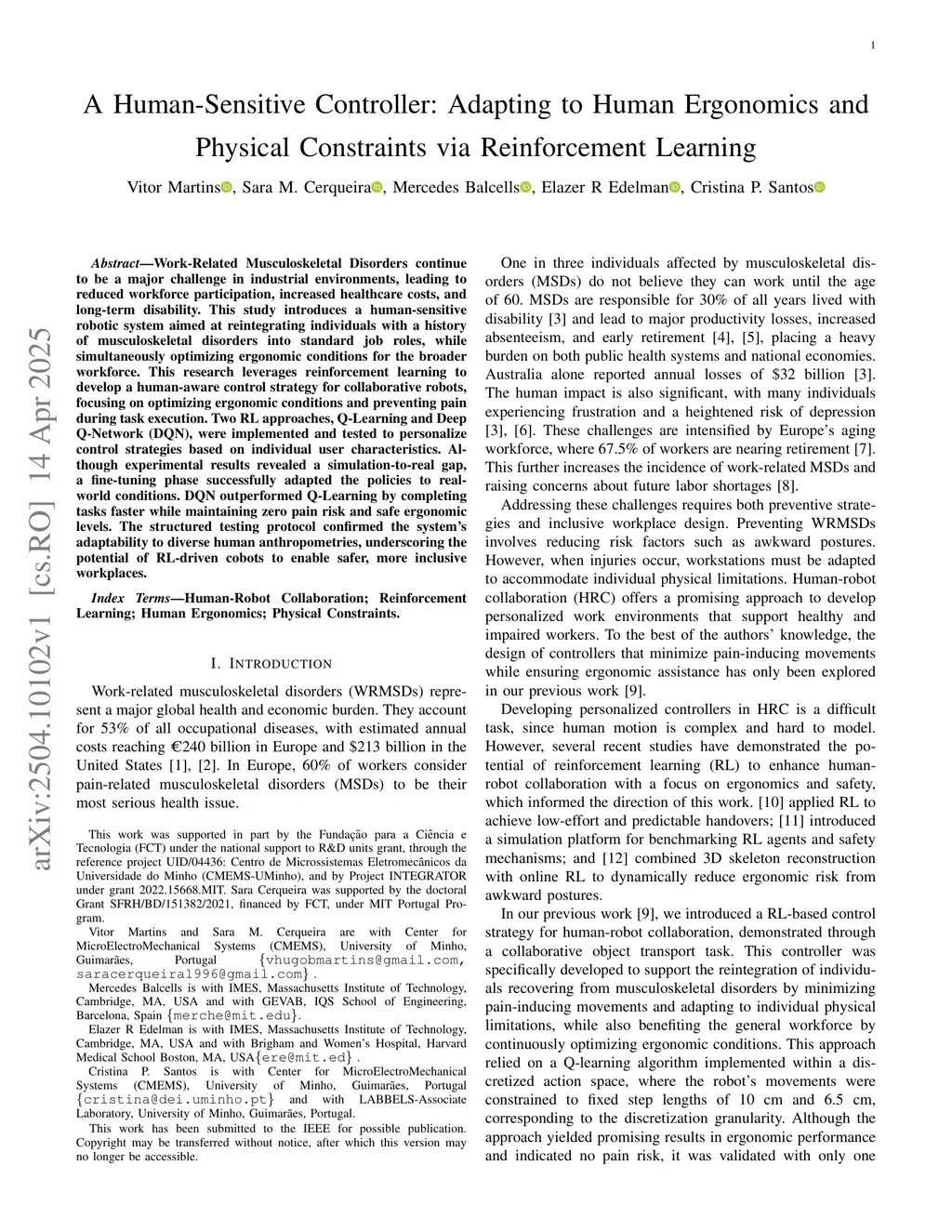 Work-Related Musculoskeletal Disorders continue to be a major challenge in industrial environments, leading to reduced workforce participation, increased healthcare costs, and long-term disability. This study introduces a human-sensitive robotic system aimed at reintegrating individuals with a history of musculoskeletal disorders into standard job roles, while simultaneously optimizing ergonomic conditions for the broader workforce. This research leverages reinforcement learning to develop a human-aware control strategy for collaborative robots, focusing on optimizing ergonomic conditions and preventing pain during task execution. Two RL approaches, Q-Learning and Deep Q-Network (DQN), were implemented and tested to personalize control strategies based on individual user characteristics. Although experimental results revealed a simulation-to-real gap, a fine-tuning phase successfully adapted the policies to real-world conditions. DQN outperformed Q-Learning by completing tasks faster while maintaining zero pain risk and safe ergonomic levels. The structured testing protocol confirmed the system's adaptability to diverse human anthropometries, underscoring the potential of RL-driven cobots to enable safer, more inclusive workplaces.