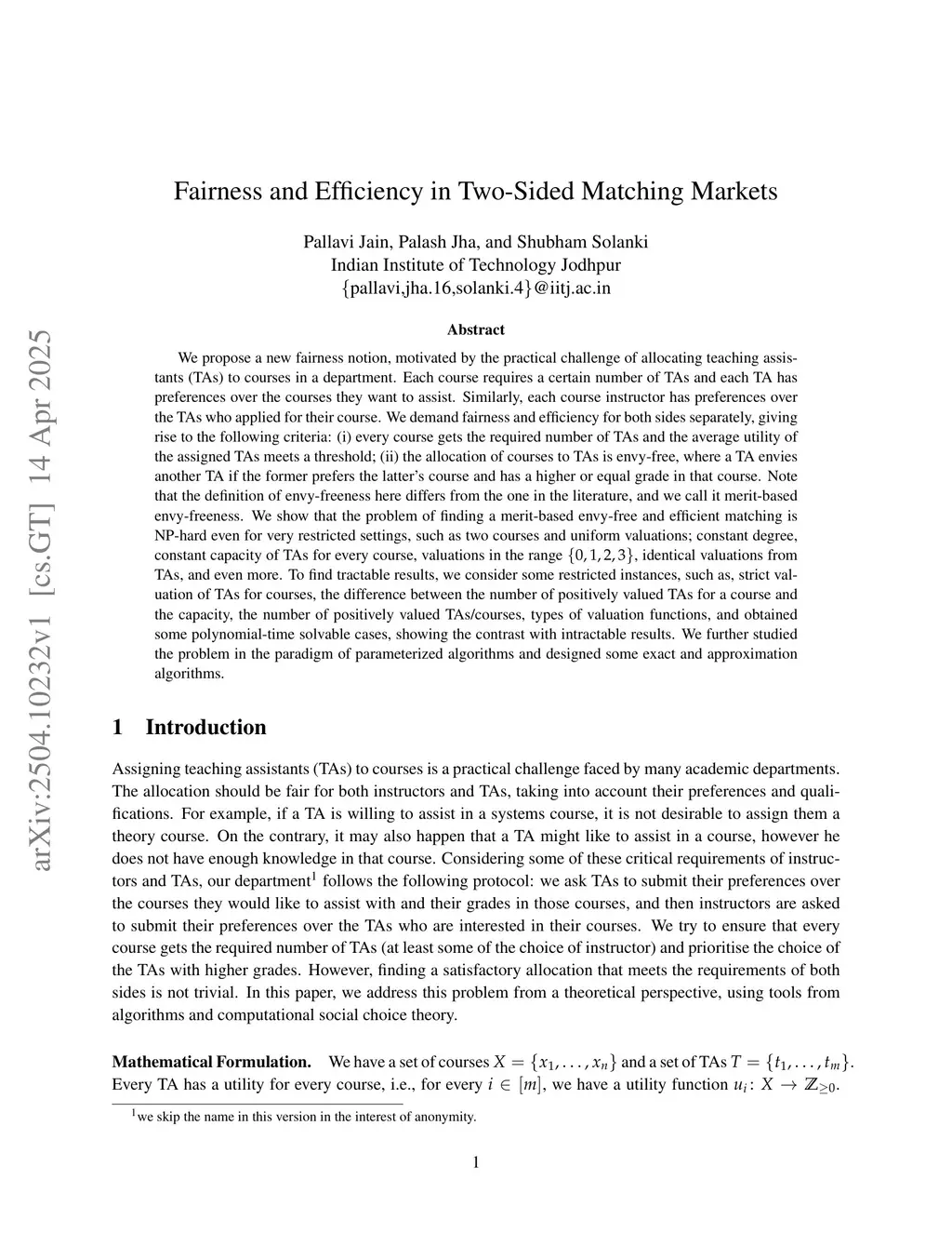 We propose a new fairness notion, motivated by the practical challenge of allocating teaching assistants (TAs) to courses in a department. Each course requires a certain number of TAs and each TA has preferences over the courses they want to assist. Similarly, each course instructor has preferences over the TAs who applied for their course. We demand fairness and efficiency for both sides separately, giving rise to the following criteria: (i) every course gets the required number of TAs and the average utility of the assigned TAs meets a threshold; (ii) the allocation of courses to TAs is envy-free, where a TA envies another TA if the former prefers the latter's course and has a higher or equal grade in that course. Note that the definition of envy-freeness here differs from the one in the literature, and we call it merit-based envy-freeness.We show that the problem of finding a merit-based envy-free and efficient matching is NP-hard even for very restricted settings, such as two courses and uniform valuations; constant degree, constant capacity of TAs for every course, valuations in the range {0,1,2,3}, identical valuations from TAs, and even more. To find tractable results, we consider some restricted instances, such as, strict valuation of TAs for courses, the difference between the number of positively valued TAs for a course and the capacity, the number of positively valued TAs/courses, types of valuation functions, and obtained some polynomial-time solvable cases, showing the contrast with intractable results. We further studied the problem in the paradigm of parameterized algorithms and designed some exact and approximation algorithms.