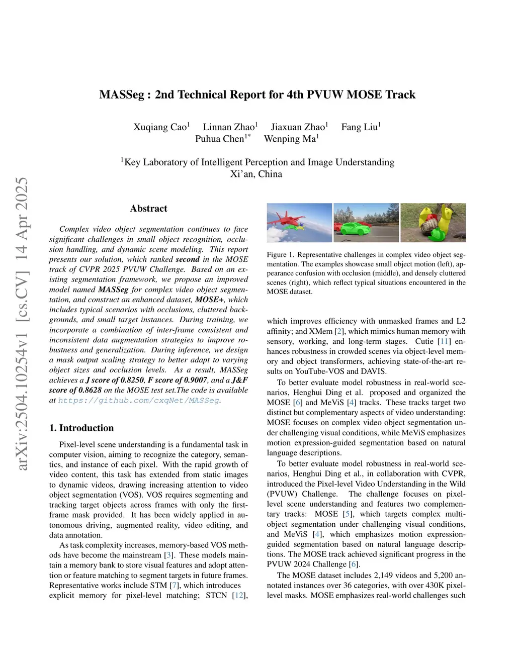 Complex video object segmentation continues to face significant challenges in small object recognition, occlusion handling, and dynamic scene modeling. This report presents our solution, which ranked second in the MOSE track of CVPR 2025 PVUW Challenge. Based on an existing segmentation framework, we propose an improved model named MASSeg for complex video object segmentation, and construct an enhanced dataset, MOSE+, which includes typical scenarios with occlusions, cluttered backgrounds, and small target instances. During training, we incorporate a combination of inter-frame consistent and inconsistent data augmentation strategies to improve robustness and generalization. During inference, we design a mask output scaling strategy to better adapt to varying object sizes and occlusion levels. As a result, MASSeg achieves a J score of 0.8250, F score of 0.9007, and a J&F score of 0.8628 on the MOSE test set.
