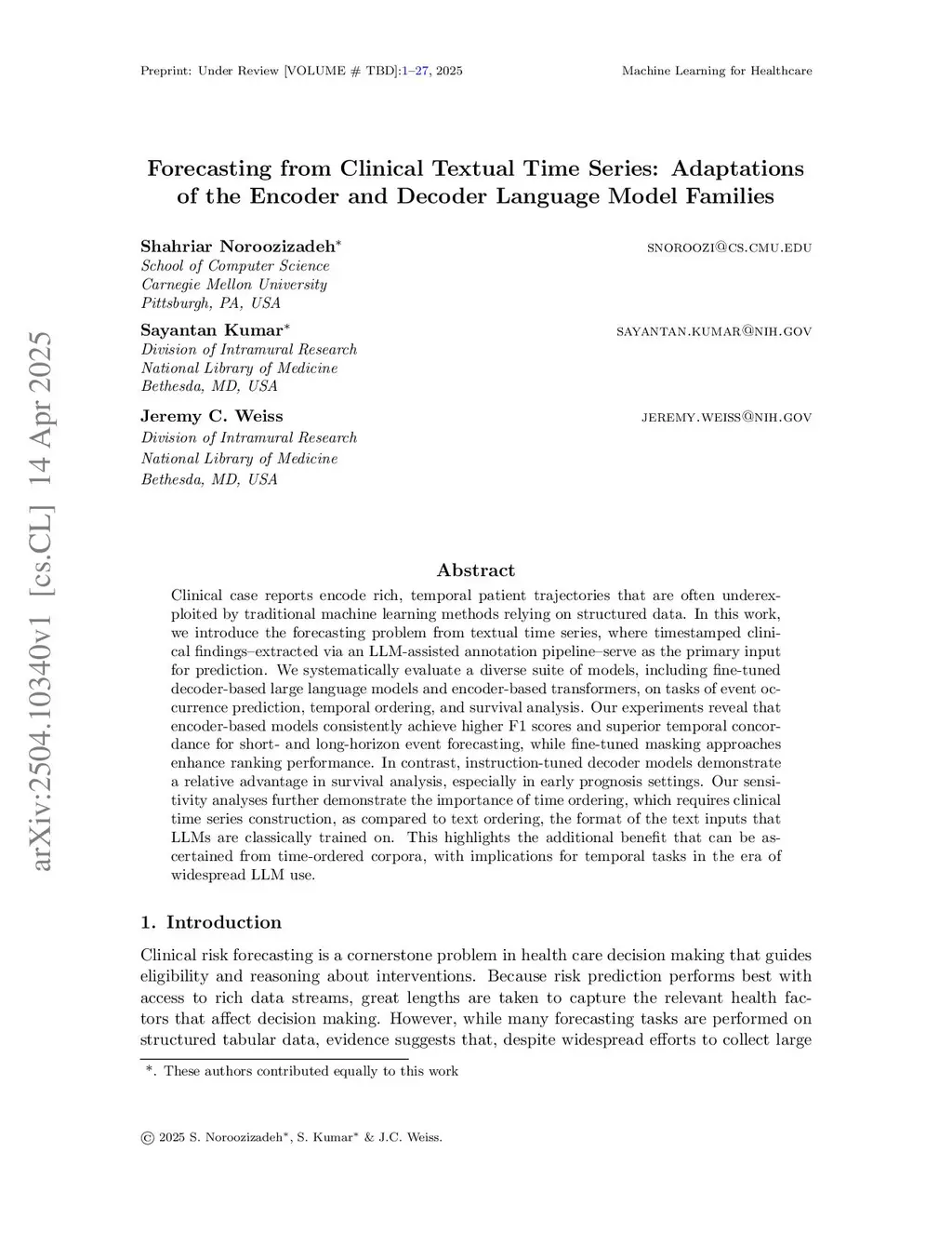 Clinical case reports encode temporal patient trajectories that are often underexploited by traditional machine learning methods relying on structured data. In this work, we introduce the forecasting problem from textual time series, where timestamped clinical findings -- extracted via an LLM-assisted annotation pipeline -- serve as the primary input for prediction. We systematically evaluate a diverse suite of models, including fine-tuned decoder-based large language models and encoder-based transformers, on tasks of event occurrence prediction, temporal ordering, and survival analysis. Our experiments reveal that encoder-based models consistently achieve higher F1 scores and superior temporal concordance for short- and long-horizon event forecasting, while fine-tuned masking approaches enhance ranking performance. In contrast, instruction-tuned decoder models demonstrate a relative advantage in survival analysis, especially in early prognosis settings. Our sensitivity analyses further demonstrate the importance of time ordering, which requires clinical time series construction, as compared to text ordering, the format of the text inputs that LLMs are classically trained on. This highlights the additional benefit that can be ascertained from time-ordered corpora, with implications for temporal tasks in the era of widespread LLM use.