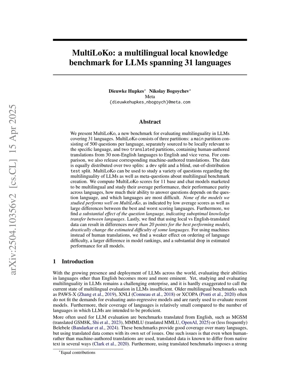 We present MultiLoKo, a new benchmark for evaluating multilinguality in LLMs covering 31 languages. MultiLoKo consists of three partitions: a main partition consisting of 500 questions per language, separately sourced to be locally relevant to the specific language, and two translated partitions, containing human-authored translations from 30 non-English languages to English and vice versa. For comparison, we also release corresponding machine-authored translations. The data is equally distributed over two splits: a dev split and a blind, out-of-distribution test split. MultiLoKo can be used to study a variety of questions regarding the multilinguality of LLMs as well as meta-questions about multilingual benchmark creation. We compute MultiLoKo scores for 11 base and chat models marketed to be multilingual and study their average performance, their performance parity across languages, how much their ability to answer questions depends on the question language, and which languages are most difficult. None of the models we studied performs well on MultiLoKo, as indicated by low average scores as well as large differences between the best and worst scoring languages. Furthermore, we find a substantial effect of the question language, indicating sub-optimal knowledge transfer between languages. Lastly, we find that using local vs English-translated data can result in differences more than 20 points for the best performing models, drastically change the estimated difficulty of some languages. For using machines instead of human translations, we find a weaker effect on ordering of language difficulty, a larger difference in model rankings, and a substantial drop in estimated performance for all models.