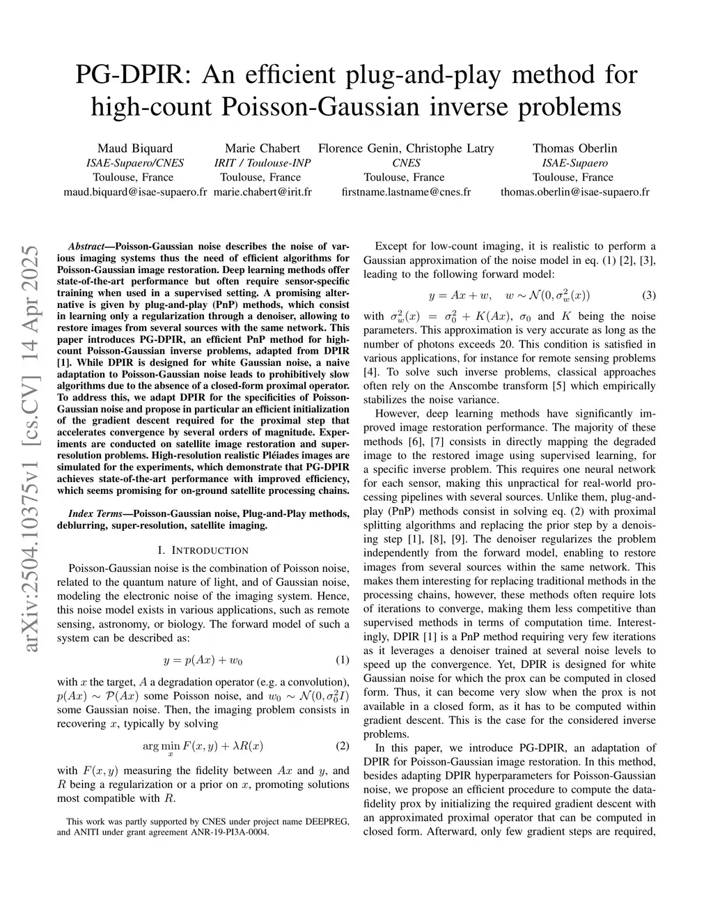 Poisson-Gaussian noise describes the noise of various imaging systems thus the need of efficient algorithms for Poisson-Gaussian image restoration. Deep learning methods offer state-of-the-art performance but often require sensor-specific training when used in a supervised setting. A promising alternative is given by plug-and-play (PnP) methods, which consist in learning only a regularization through a denoiser, allowing to restore images from several sources with the same network. This paper introduces PG-DPIR, an efficient PnP method for high-count Poisson-Gaussian inverse problems, adapted from DPIR. While DPIR is designed for white Gaussian noise, a naive adaptation to Poisson-Gaussian noise leads to prohibitively slow algorithms due to the absence of a closed-form proximal operator. To address this, we adapt DPIR for the specificities of Poisson-Gaussian noise and propose in particular an efficient initialization of the gradient descent required for the proximal step that accelerates convergence by several orders of magnitude. Experiments are conducted on satellite image restoration and super-resolution problems. High-resolution realistic Pleiades images are simulated for the experiments, which demonstrate that PG-DPIR achieves state-of-the-art performance with improved efficiency, which seems promising for on-ground satellite processing chains.