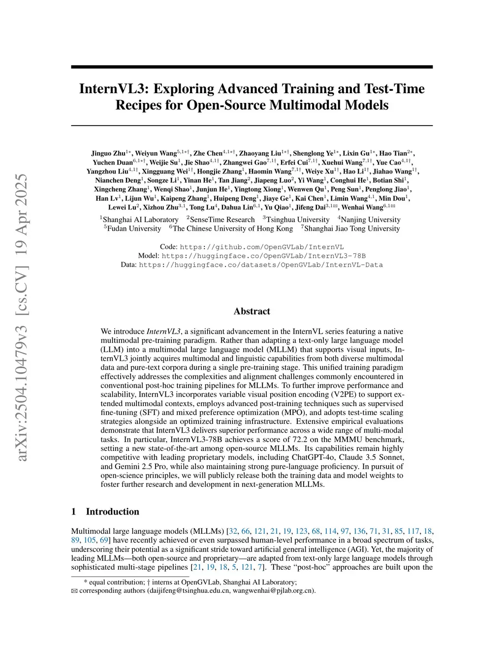 We introduce InternVL3, a significant advancement in the InternVL series featuring a native multimodal pre-training paradigm. Rather than adapting a text-only large language model (LLM) into a multimodal large language model (MLLM) that supports visual inputs, InternVL3 jointly acquires multimodal and linguistic capabilities from both diverse multimodal data and pure-text corpora during a single pre-training stage. This unified training paradigm effectively addresses the complexities and alignment challenges commonly encountered in conventional post-hoc training pipelines for MLLMs. To further improve performance and scalability, InternVL3 incorporates variable visual position encoding (V2PE) to support extended multimodal contexts, employs advanced post-training techniques such as supervised fine-tuning (SFT) and mixed preference optimization (MPO), and adopts test-time scaling strategies alongside an optimized training infrastructure. Extensive empirical evaluations demonstrate that InternVL3 delivers superior performance across a wide range of multi-modal tasks. In particular, InternVL3-78B achieves a score of 72.2 on the MMMU benchmark, setting a new state-of-the-art among open-source MLLMs. Its capabilities remain highly competitive with leading proprietary models, including ChatGPT-4o, Claude 3.5 Sonnet, and Gemini 2.5 Pro, while also maintaining strong pure-language proficiency. In pursuit of open-science principles, we will publicly release both the training data and model weights to foster further research and development in next-generation MLLMs.