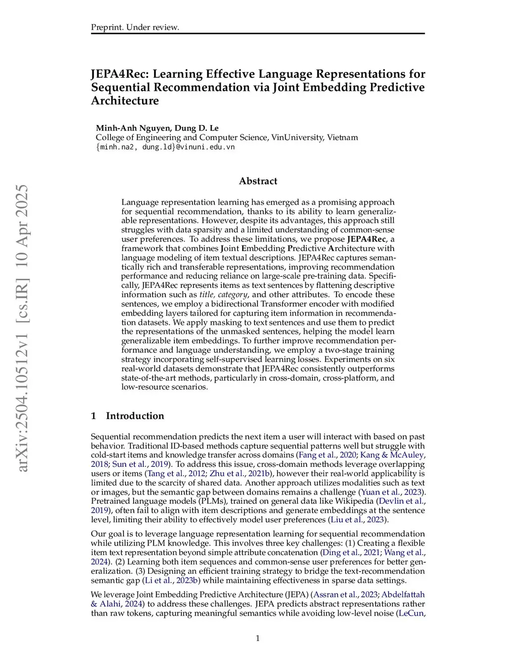 Language representation learning has emerged as a promising approach for sequential recommendation, thanks to its ability to learn generalizable representations. However, despite its advantages, this approach still struggles with data sparsity and a limited understanding of common-sense user preferences. To address these limitations, we propose , a framework that combines oint mbedding redictive rchitecture with language modeling of item textual descriptions. JEPA4Rec captures semantically rich and transferable representations, improving recommendation performance and reducing reliance on large-scale pre-training data. Specifically, JEPA4Rec represents items as text sentences by flattening descriptive information such as , and other attributes. To encode these sentences, we employ a bidirectional Transformer encoder with modified embedding layers tailored for capturing item information in recommendation datasets. We apply masking to text sentences and use them to predict the representations of the unmasked sentences, helping the model learn generalizable item embeddings. To further improve recommendation performance and language understanding, we employ a two-stage training strategy incorporating self-supervised learning losses. Experiments on six real-world datasets demonstrate that JEPA4Rec consistently outperforms state-of-the-art methods, particularly in cross-domain, cross-platform, and low-resource scenarios.