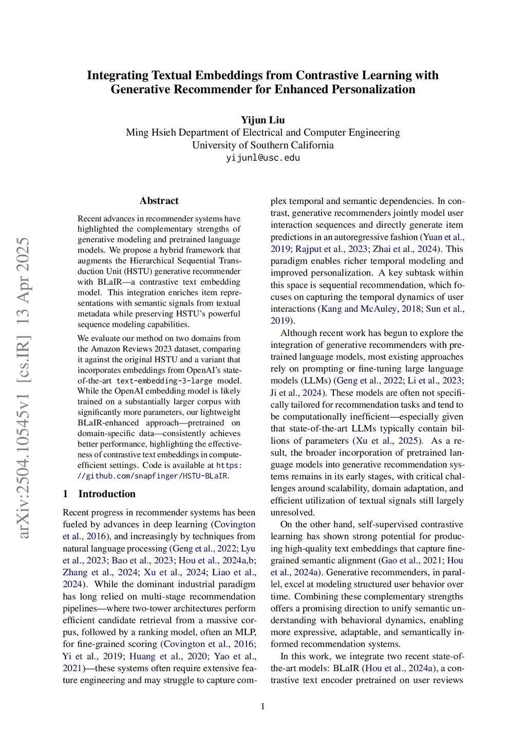Recent advances in recommender systems have underscored the complementary strengths of generative modeling and pretrained language models. We propose HSTU-BLaIR, a hybrid framework that augments the Hierarchical Sequential Transduction Unit (HSTU)-based generative recommender with BLaIR, a lightweight contrastive text embedding model. This integration enriches item representations with semantic signals from textual metadata while preserving HSTU's powerful sequence modeling capabilities.We evaluate HSTU-BLaIR on two e-commerce datasets: three subsets from the Amazon Reviews 2023 dataset and the Steam dataset. We compare its performance against both the original HSTU-based recommender and a variant augmented with embeddings from OpenAI's state-of-the-art \texttt{text-embedding-3-large} model. Despite the latter being trained on a substantially larger corpus with significantly more parameters, our lightweight BLaIR-enhanced approach -- pretrained on domain-specific data -- achieves better performance in nearly all cases. Specifically, HSTU-BLaIR outperforms the OpenAI embedding-based variant on all but one metric, where it is marginally lower, and matches it on another. These findings highlight the effectiveness of contrastive text embeddings in compute-efficient recommendation settings.