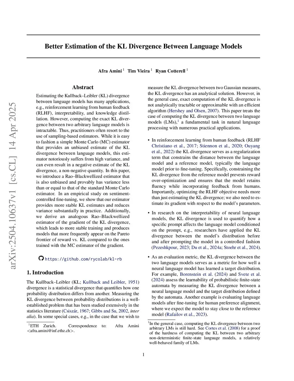 Estimating the Kullback--Leibler (KL) divergence between language models has many applications, e.g., reinforcement learning from human feedback (RLHF), interpretability, and knowledge distillation. However, computing the exact KL divergence between two arbitrary language models is intractable. Thus, practitioners often resort to sampling-based estimators. While it is easy to fashion a simple Monte Carlo (MC) estimator that provides an unbiased estimate of the KL divergence between language models, this estimator notoriously suffers from high variance and can even result in a negative estimate of the KL divergence, a non-negative quantity. In this paper, we introduce a Rao--Blackwellized estimator that is unbiased and provably has variance less than or equal to that of the standard Monte Carlo estimator. In an empirical study on sentiment-controlled fine-tuning, we show that our estimator provides more stable KL estimates and reduces variance substantially. Additionally, we derive an analogous Rao--Blackwellized estimator of the gradient of the KL divergence, which leads to more stable training and produces models that more frequently appear on the Pareto frontier of reward vs. KL compared to the ones trained with the MC estimator of the gradient.