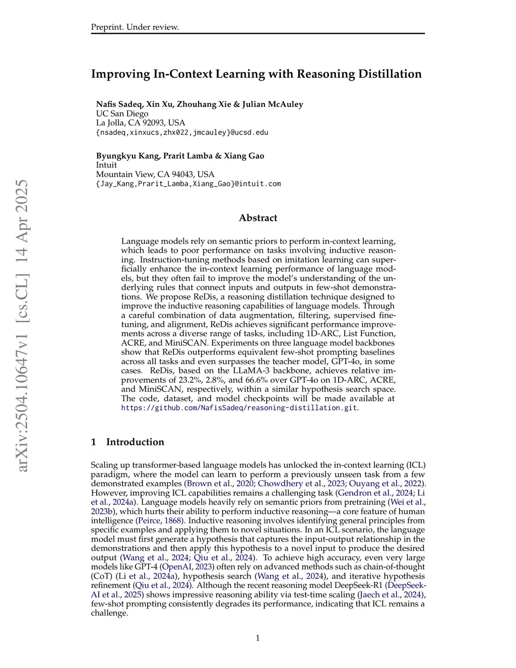 Language models rely on semantic priors to perform in-context learning, which leads to poor performance on tasks involving inductive reasoning. Instruction-tuning methods based on imitation learning can superficially enhance the in-context learning performance of language models, but they often fail to improve the model's understanding of the underlying rules that connect inputs and outputs in few-shot demonstrations. We propose ReDis, a reasoning distillation technique designed to improve the inductive reasoning capabilities of language models. Through a careful combination of data augmentation, filtering, supervised fine-tuning, and alignment, ReDis achieves significant performance improvements across a diverse range of tasks, including 1D-ARC, List Function, ACRE, and MiniSCAN. Experiments on three language model backbones show that ReDis outperforms equivalent few-shot prompting baselines across all tasks and even surpasses the teacher model, GPT-4o, in some cases. ReDis, based on the LLaMA-3 backbone, achieves relative improvements of 23.2%, 2.8%, and 66.6% over GPT-4o on 1D-ARC, ACRE, and MiniSCAN, respectively, within a similar hypothesis search space. The code, dataset, and model checkpoints will be made available atthis https URL.