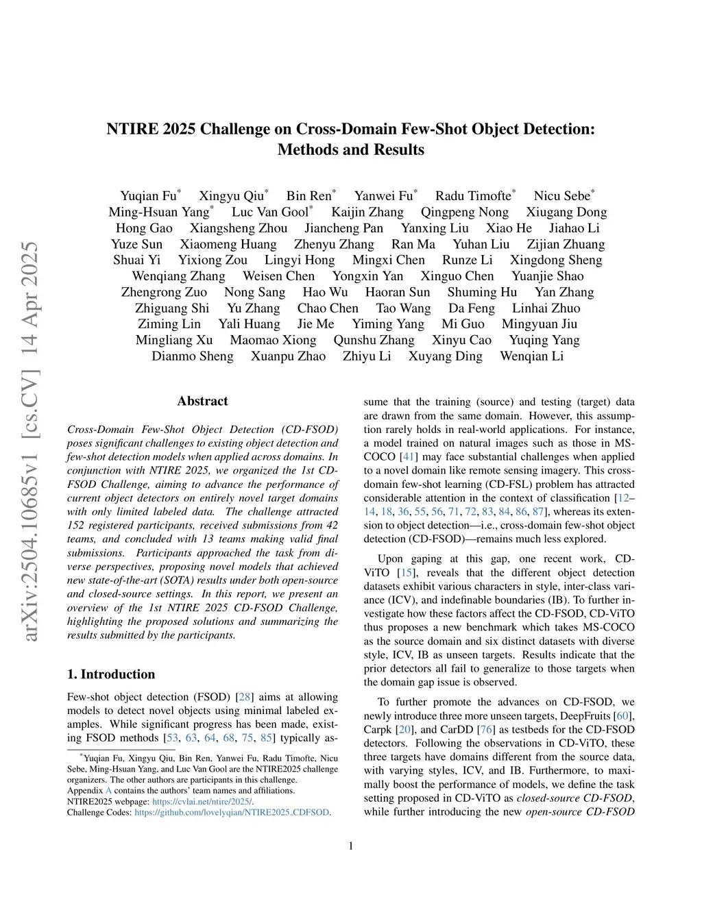 Cross-Domain Few-Shot Object Detection (CD-FSOD) poses significant challenges to existing object detection and few-shot detection models when applied across domains. In conjunction with NTIRE 2025, we organized the 1st CD-FSOD Challenge, aiming to advance the performance of current object detectors on entirely novel target domains with only limited labeled data. The challenge attracted 152 registered participants, received submissions from 42 teams, and concluded with 13 teams making valid final submissions. Participants approached the task from diverse perspectives, proposing novel models that achieved new state-of-the-art (SOTA) results under both open-source and closed-source settings. In this report, we present an overview of the 1st NTIRE 2025 CD-FSOD Challenge, highlighting the proposed solutions and summarizing the results submitted by the participants.