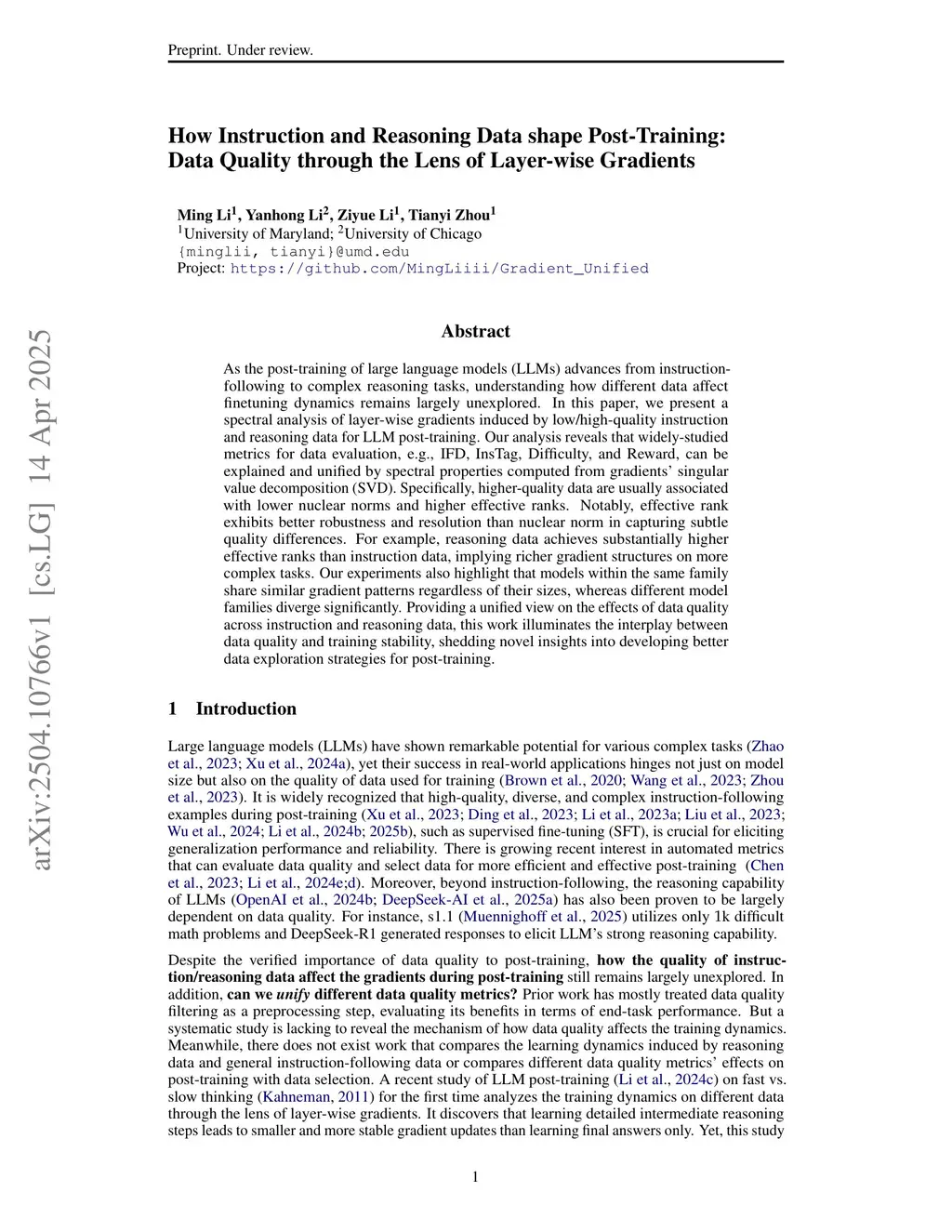 As the post-training of large language models (LLMs) advances from instruction-following to complex reasoning tasks, understanding how different data affect finetuning dynamics remains largely unexplored. In this paper, we present a spectral analysis of layer-wise gradients induced by low/high-quality instruction and reasoning data for LLM post-training. Our analysis reveals that widely-studied metrics for data evaluation, e.g., IFD, InsTag, Difficulty, and Reward, can be explained and unified by spectral properties computed from gradients' singular value decomposition (SVD). Specifically, higher-quality data are usually associated with lower nuclear norms and higher effective ranks. Notably, effective rank exhibits better robustness and resolution than nuclear norm in capturing subtle quality differences. For example, reasoning data achieves substantially higher effective ranks than instruction data, implying richer gradient structures on more complex tasks. Our experiments also highlight that models within the same family share similar gradient patterns regardless of their sizes, whereas different model families diverge significantly. Providing a unified view on the effects of data quality across instruction and reasoning data, this work illuminates the interplay between data quality and training stability, shedding novel insights into developing better data exploration strategies for post-training.
