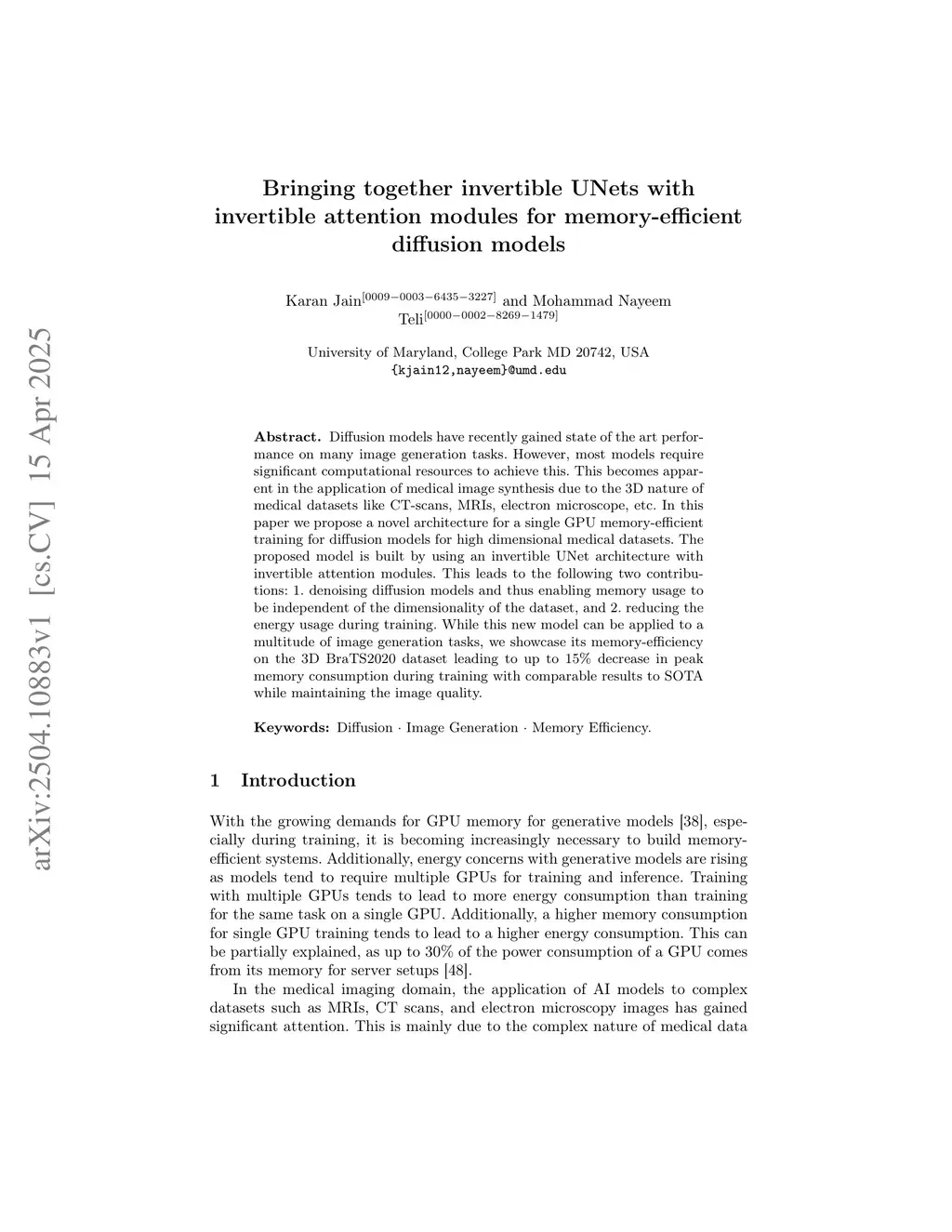 Diffusion models have recently gained state of the art performance on many image generation tasks. However, most models require significant computational resources to achieve this. This becomes apparent in the application of medical image synthesis due to the 3D nature of medical datasets like CT-scans, MRIs, electron microscope, etc. In this paper we propose a novel architecture for a single GPU memory-efficient training for diffusion models for high dimensional medical datasets. The proposed model is built by using an invertible UNet architecture with invertible attention modules. This leads to the following two contributions: 1. denoising diffusion models and thus enabling memory usage to be independent of the dimensionality of the dataset, and 2. reducing the energy usage during training. While this new model can be applied to a multitude of image generation tasks, we showcase its memory-efficiency on the 3D BraTS2020 dataset leading to up to 15\% decrease in peak memory consumption during training with comparable results to SOTA while maintaining the image quality.