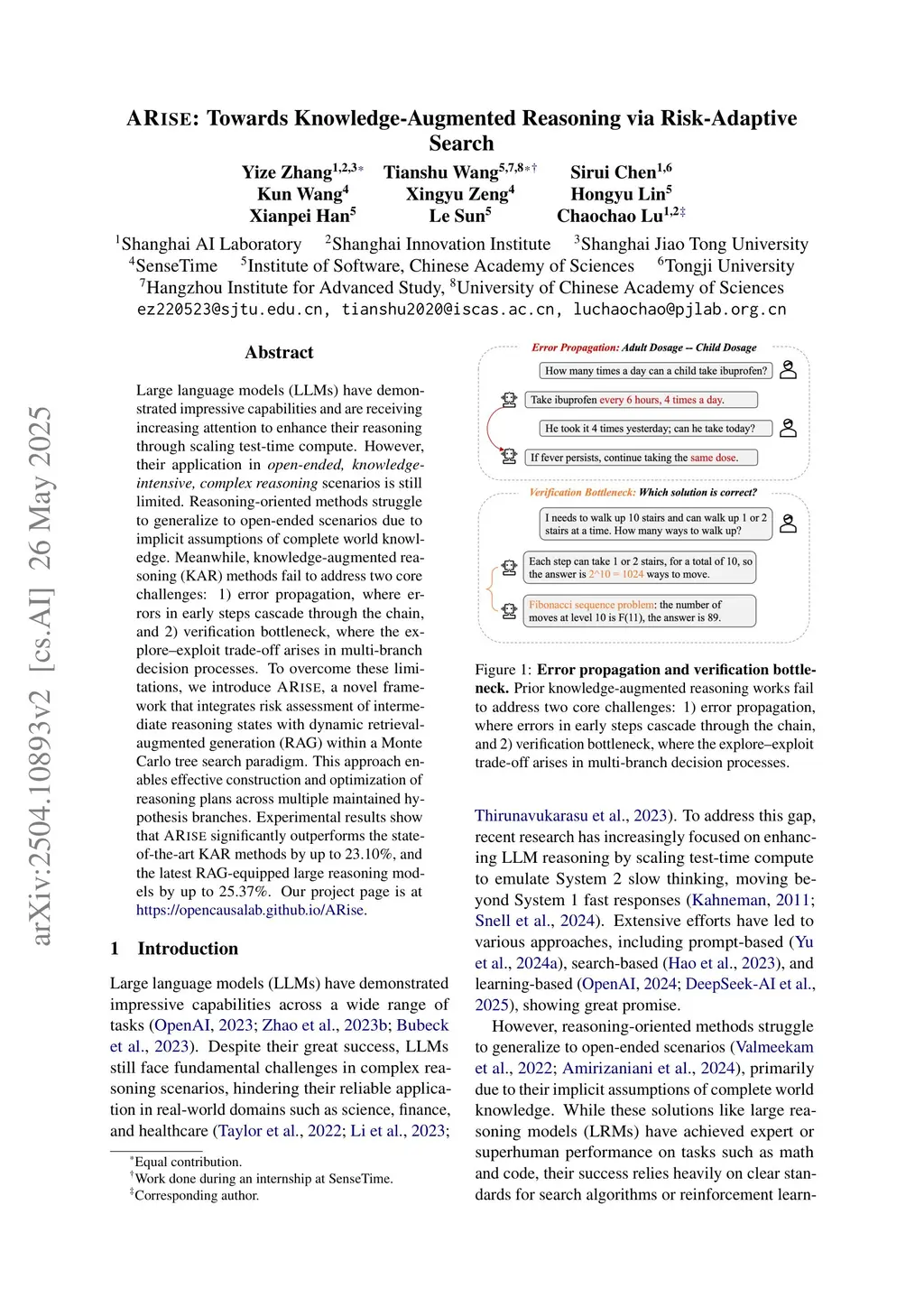 Large language models (LLMs) have demonstrated impressive capabilities and are receiving increasing attention to enhance their reasoning through scaling test--time compute. However, their application in open--ended, knowledge--intensive, complex reasoning scenarios is still limited. Reasoning--oriented methods struggle to generalize to open--ended scenarios due to implicit assumptions of complete world knowledge. Meanwhile, knowledge--augmented reasoning (KAR) methods fail to address two core challenges: 1) error propagation, where errors in early steps cascade through the chain, and 2) verification bottleneck, where the explore--exploit tradeoff arises in multi--branch decision processes. To overcome these limitations, we introduce ARise, a novel framework that integrates risk assessment of intermediate reasoning states with dynamic retrieval--augmented generation (RAG) within a Monte Carlo tree search paradigm. This approach enables effective construction and optimization of reasoning plans across multiple maintained hypothesis branches. Experimental results show that ARise significantly outperforms the state--of--the--art KAR methods by up to 23.10%, and the latest RAG-equipped large reasoning models by up to 25.37%. Our project page is atthis https URL.