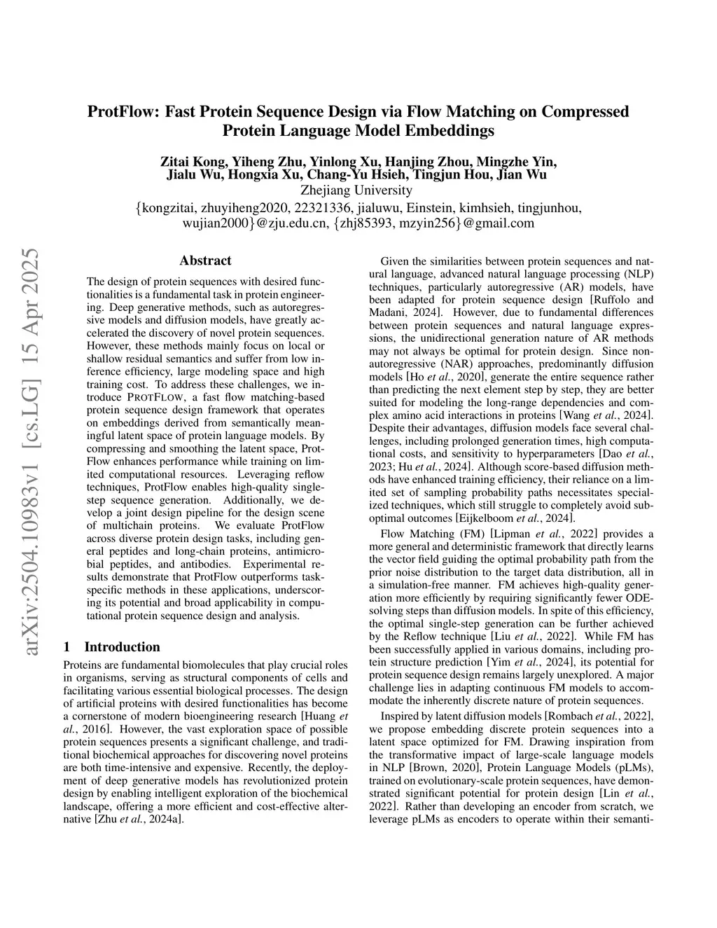The design of protein sequences with desired functionalities is a fundamental task in protein engineering. Deep generative methods, such as autoregressive models and diffusion models, have greatly accelerated the discovery of novel protein sequences. However, these methods mainly focus on local or shallow residual semantics and suffer from low inference efficiency, large modeling space and high training cost. To address these challenges, we introduce ProtFlow, a fast flow matching-based protein sequence design framework that operates on embeddings derived from semantically meaningful latent space of protein language models. By compressing and smoothing the latent space, ProtFlow enhances performance while training on limited computational resources. Leveraging reflow techniques, ProtFlow enables high-quality single-step sequence generation. Additionally, we develop a joint design pipeline for the design scene of multichain proteins. We evaluate ProtFlow across diverse protein design tasks, including general peptides and long-chain proteins, antimicrobial peptides, and antibodies. Experimental results demonstrate that ProtFlow outperforms task-specific methods in these applications, underscoring its potential and broad applicability in computational protein sequence design and analysis.
