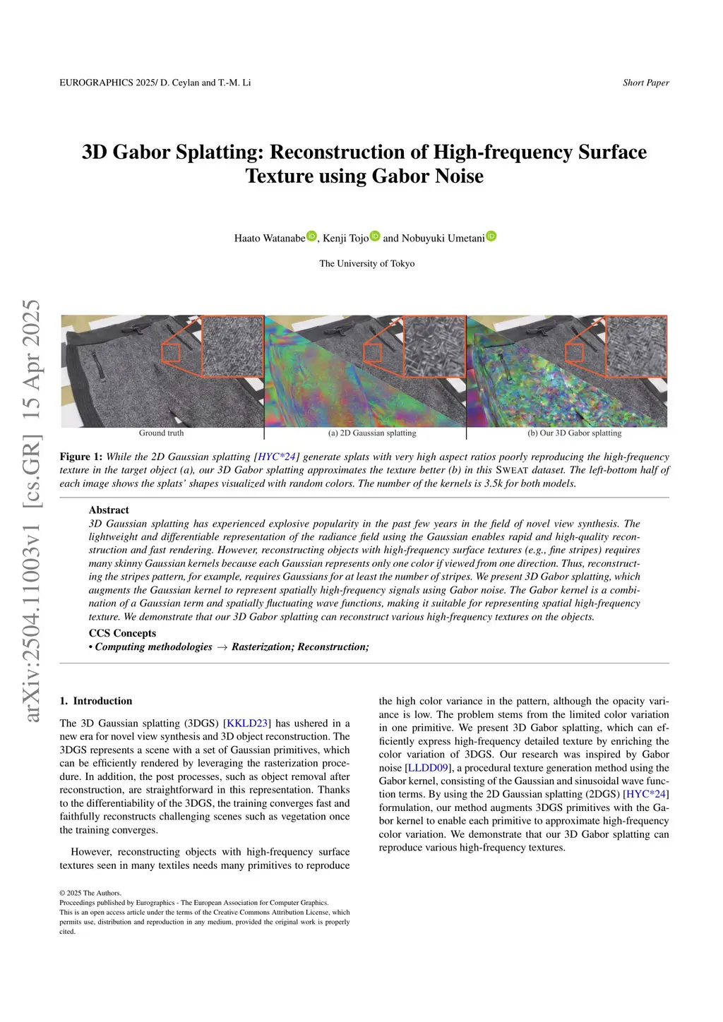 3D Gaussian splatting has experienced explosive popularity in the past few years in the field of novel view synthesis. The lightweight and differentiable representation of the radiance field using the Gaussian enables rapid and high-quality reconstruction and fast rendering. However, reconstructing objects with high-frequency surface textures (e.g., fine stripes) requires many skinny Gaussian kernels because each Gaussian represents only one color if viewed from one direction. Thus, reconstructing the stripes pattern, for example, requires Gaussians for at least the number of stripes. We present 3D Gabor splatting, which augments the Gaussian kernel to represent spatially high-frequency signals using Gabor noise. The Gabor kernel is a combination of a Gaussian term and spatially fluctuating wave functions, making it suitable for representing spatial high-frequency texture. We demonstrate that our 3D Gabor splatting can reconstruct various high-frequency textures on the objects.