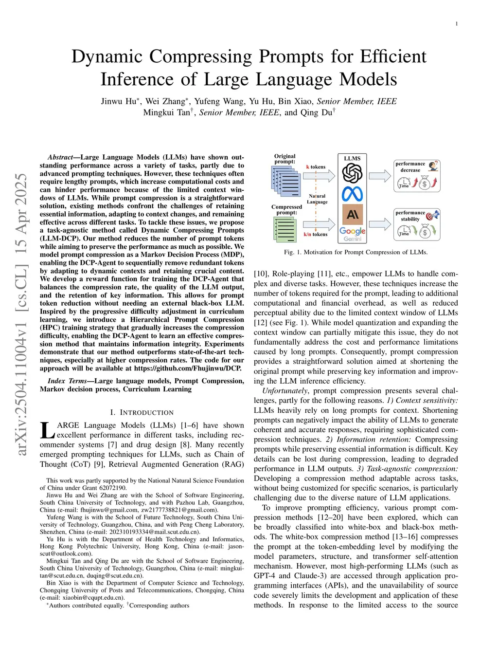 Large Language Models (LLMs) have shown outstanding performance across a variety of tasks, partly due to advanced prompting techniques. However, these techniques often require lengthy prompts, which increase computational costs and can hinder performance because of the limited context windows of LLMs. While prompt compression is a straightforward solution, existing methods confront the challenges of retaining essential information, adapting to context changes, and remaining effective across different tasks. To tackle these issues, we propose a task-agnostic method called Dynamic Compressing Prompts (LLM-DCP). Our method reduces the number of prompt tokens while aiming to preserve the performance as much as possible. We model prompt compression as a Markov Decision Process (MDP), enabling the DCP-Agent to sequentially remove redundant tokens by adapting to dynamic contexts and retaining crucial content. We develop a reward function for training the DCP-Agent that balances the compression rate, the quality of the LLM output, and the retention of key information. This allows for prompt token reduction without needing an external black-box LLM. Inspired by the progressive difficulty adjustment in curriculum learning, we introduce a Hierarchical Prompt Compression (HPC) training strategy that gradually increases the compression difficulty, enabling the DCP-Agent to learn an effective compression method that maintains information integrity. Experiments demonstrate that our method outperforms state-of-the-art techniques, especially at higher compression rates. The code for our approach will be available atthis https URL.