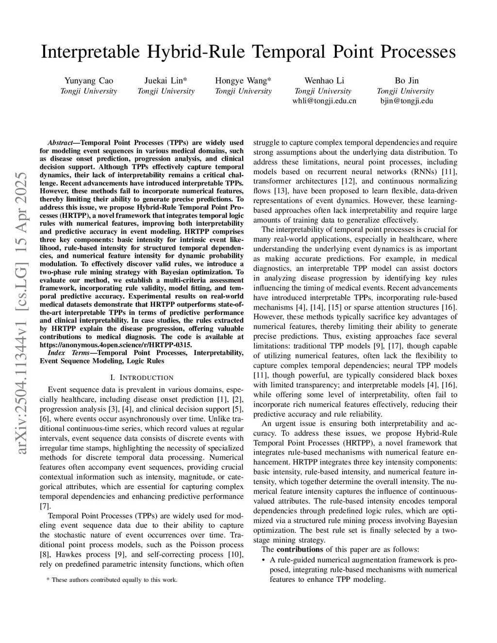 Temporal Point Processes (TPPs) are widely used for modeling event sequences in various medical domains, such as disease onset prediction, progression analysis, and clinical decision support. Although TPPs effectively capture temporal dynamics, their lack of interpretability remains a critical challenge. Recent advancements have introduced interpretable TPPs. However, these methods fail to incorporate numerical features, thereby limiting their ability to generate precise predictions. To address this issue, we propose Hybrid-Rule Temporal Point Processes (HRTPP), a novel framework that integrates temporal logic rules with numerical features, improving both interpretability and predictive accuracy in event modeling. HRTPP comprises three key components: basic intensity for intrinsic event likelihood, rule-based intensity for structured temporal dependencies, and numerical feature intensity for dynamic probability modulation. To effectively discover valid rules, we introduce a two-phase rule mining strategy with Bayesian optimization. To evaluate our method, we establish a multi-criteria assessment framework, incorporating rule validity, model fitting, and temporal predictive accuracy. Experimental results on real-world medical datasets demonstrate that HRTPP outperforms state-of-the-art interpretable TPPs in terms of predictive performance and clinical interpretability. In case studies, the rules extracted by HRTPP explain the disease progression, offering valuable contributions to medical diagnosis.