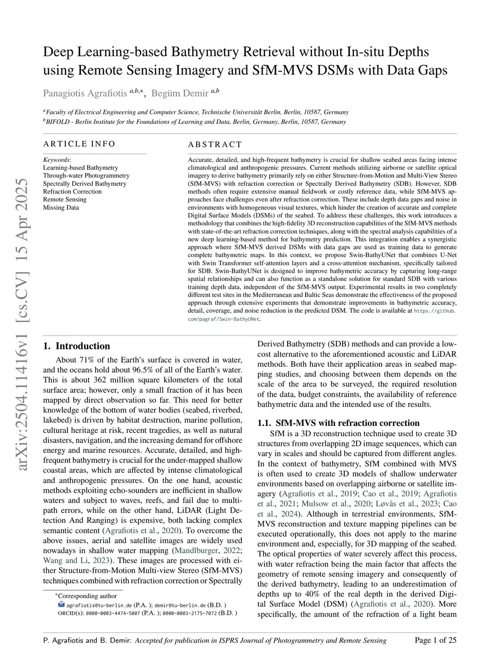 Accurate, detailed, and high-frequent bathymetry is crucial for shallow seabed areas facing intense climatological and anthropogenic pressures. Current methods utilizing airborne or satellite optical imagery to derive bathymetry primarily rely on either SfM-MVS with refraction correction or Spectrally Derived Bathymetry (SDB). However, SDB methods often require extensive manual fieldwork or costly reference data, while SfM-MVS approaches face challenges even after refraction correction. These include depth data gaps and noise in environments with homogeneous visual textures, which hinder the creation of accurate and complete Digital Surface Models (DSMs) of the seabed. To address these challenges, this work introduces a methodology that combines the high-fidelity 3D reconstruction capabilities of the SfM-MVS methods with state-of-the-art refraction correction techniques, along with the spectral analysis capabilities of a new deep learning-based method for bathymetry prediction. This integration enables a synergistic approach where SfM-MVS derived DSMs with data gaps are used as training data to generate complete bathymetric maps. In this context, we propose Swin-BathyUNet that combines U-Net with Swin Transformer self-attention layers and a cross-attention mechanism, specifically tailored for SDB. Swin-BathyUNet is designed to improve bathymetric accuracy by capturing long-range spatial relationships and can also function as a standalone solution for standard SDB with various training depth data, independent of the SfM-MVS output. Experimental results in two completely different test sites in the Mediterranean and Baltic Seas demonstrate the effectiveness of the proposed approach through extensive experiments that demonstrate improvements in bathymetric accuracy, detail, coverage, and noise reduction in the predicted DSM. The code is available atthis https URL.