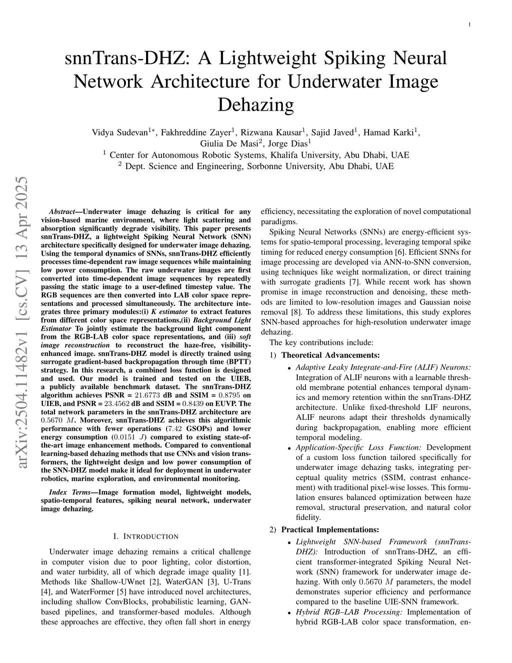 snnTrans-DHZ: A Lightweight Spiking Neural Network Architecture for Underwater Image Dehazing
