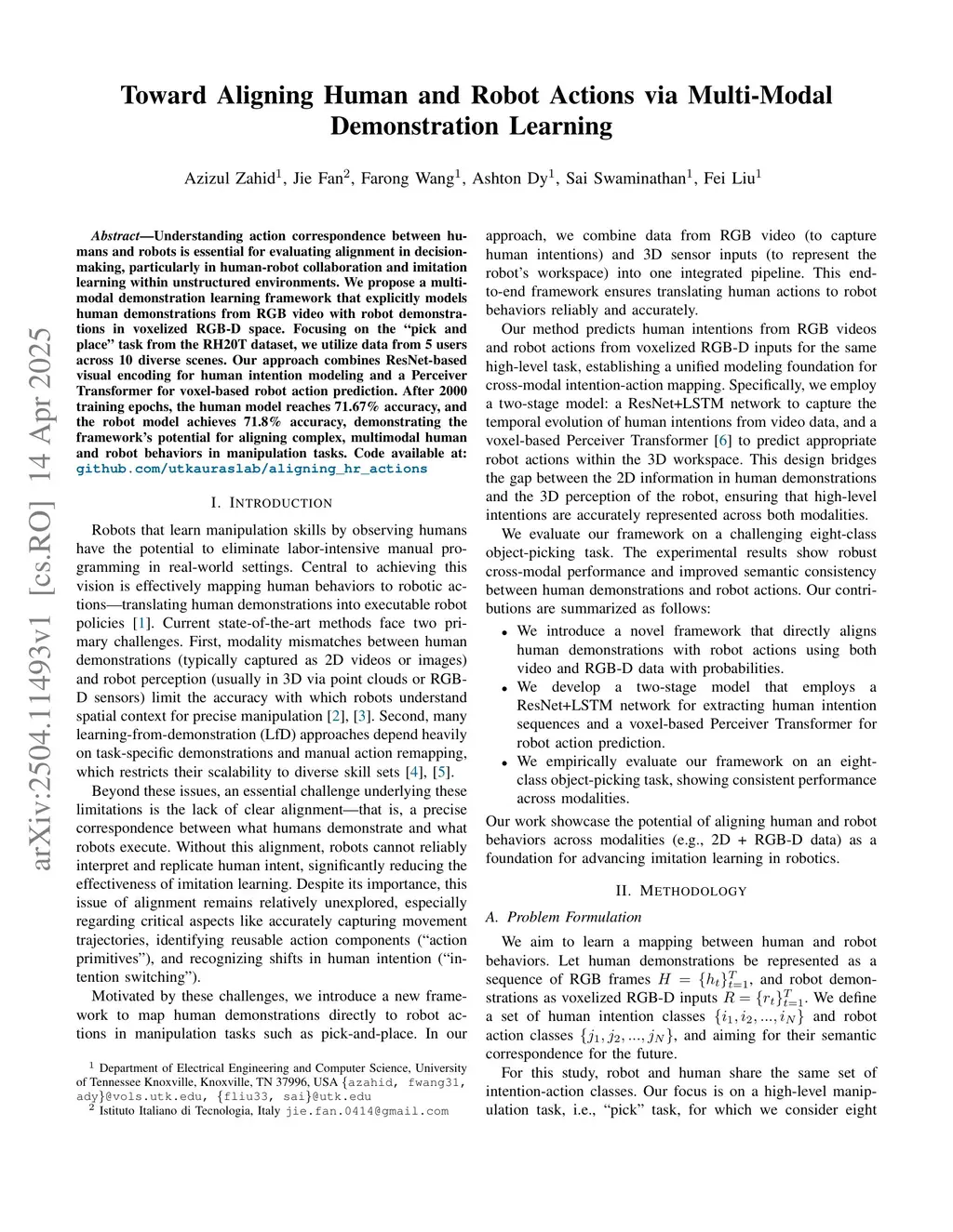 Understanding action correspondence between humans and robots is essential for evaluating alignment in decision-making, particularly in human-robot collaboration and imitation learning within unstructured environments. We propose a multimodal demonstration learning framework that explicitly models human demonstrations from RGB video with robot demonstrations in voxelized RGB-D space. Focusing on the "pick and place" task from the RH20T dataset, we utilize data from 5 users across 10 diverse scenes. Our approach combines ResNet-based visual encoding for human intention modeling and a Perceiver Transformer for voxel-based robot action prediction. After 2000 training epochs, the human model reaches 71.67% accuracy, and the robot model achieves 71.8% accuracy, demonstrating the framework's potential for aligning complex, multimodal human and robot behaviors in manipulation tasks.