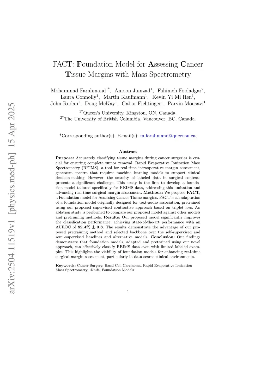 Purpose: Accurately classifying tissue margins during cancer surgeries is crucial for ensuring complete tumor removal. Rapid Evaporative Ionization Mass Spectrometry (REIMS), a tool for real-time intraoperative margin assessment, generates spectra that require machine learning models to support clinical decision-making. However, the scarcity of labeled data in surgical contexts presents a significant challenge. This study is the first to develop a foundation model tailored specifically for REIMS data, addressing this limitation and advancing real-time surgical margin assessment. Methods: We propose FACT, a Foundation model for Assessing Cancer Tissue margins. FACT is an adaptation of a foundation model originally designed for text-audio association, pretrained using our proposed supervised contrastive approach based on triplet loss. An ablation study is performed to compare our proposed model against other models and pretraining methods. Results: Our proposed model significantly improves the classification performance, achieving state-of-the-art performance with an AUROC of . The results demonstrate the advantage of our proposed pretraining method and selected backbone over the self-supervised and semi-supervised baselines and alternative models. Conclusion: Our findings demonstrate that foundation models, adapted and pretrained using our novel approach, can effectively classify REIMS data even with limited labeled examples. This highlights the viability of foundation models for enhancing real-time surgical margin assessment, particularly in data-scarce clinical environments.